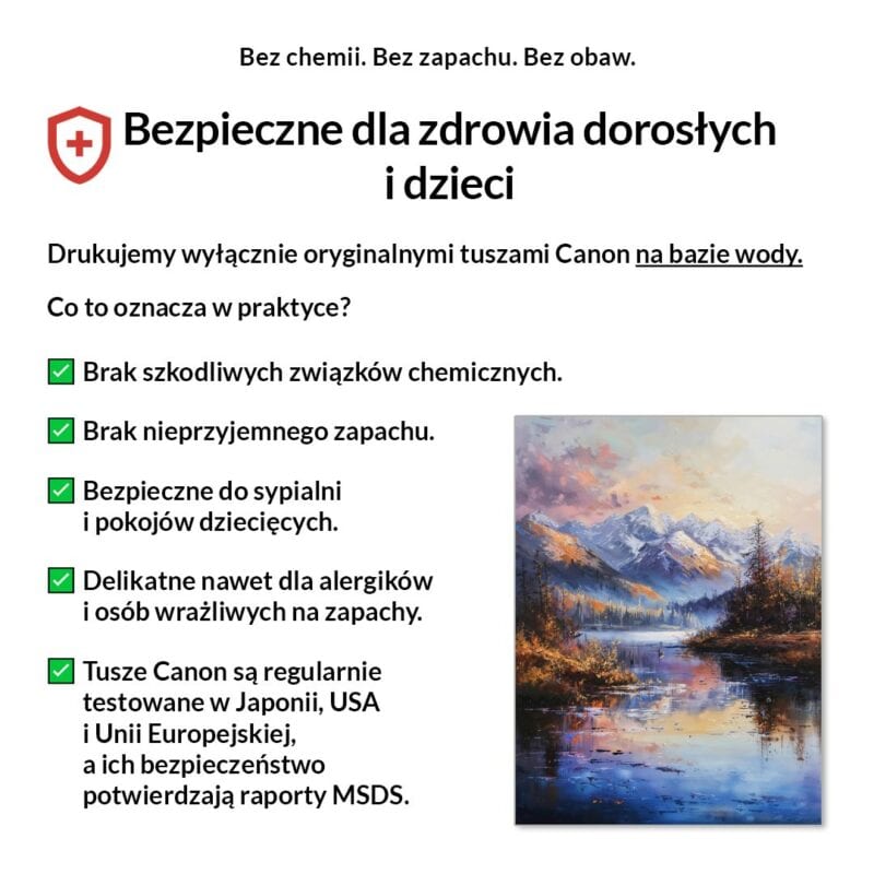 Tak, absolutnie! Drukujemy wyłącznie certyfikowanymi, bezwonnymi tuszami pigmentowymi Canon Lucia Pro na bazie wody. Są one w pełni bezpieczne dla zdrowia, nie zawierają rozpuszczalników i mogą być bez obaw stosowane w sypialniach i pokojach dziecięcych.