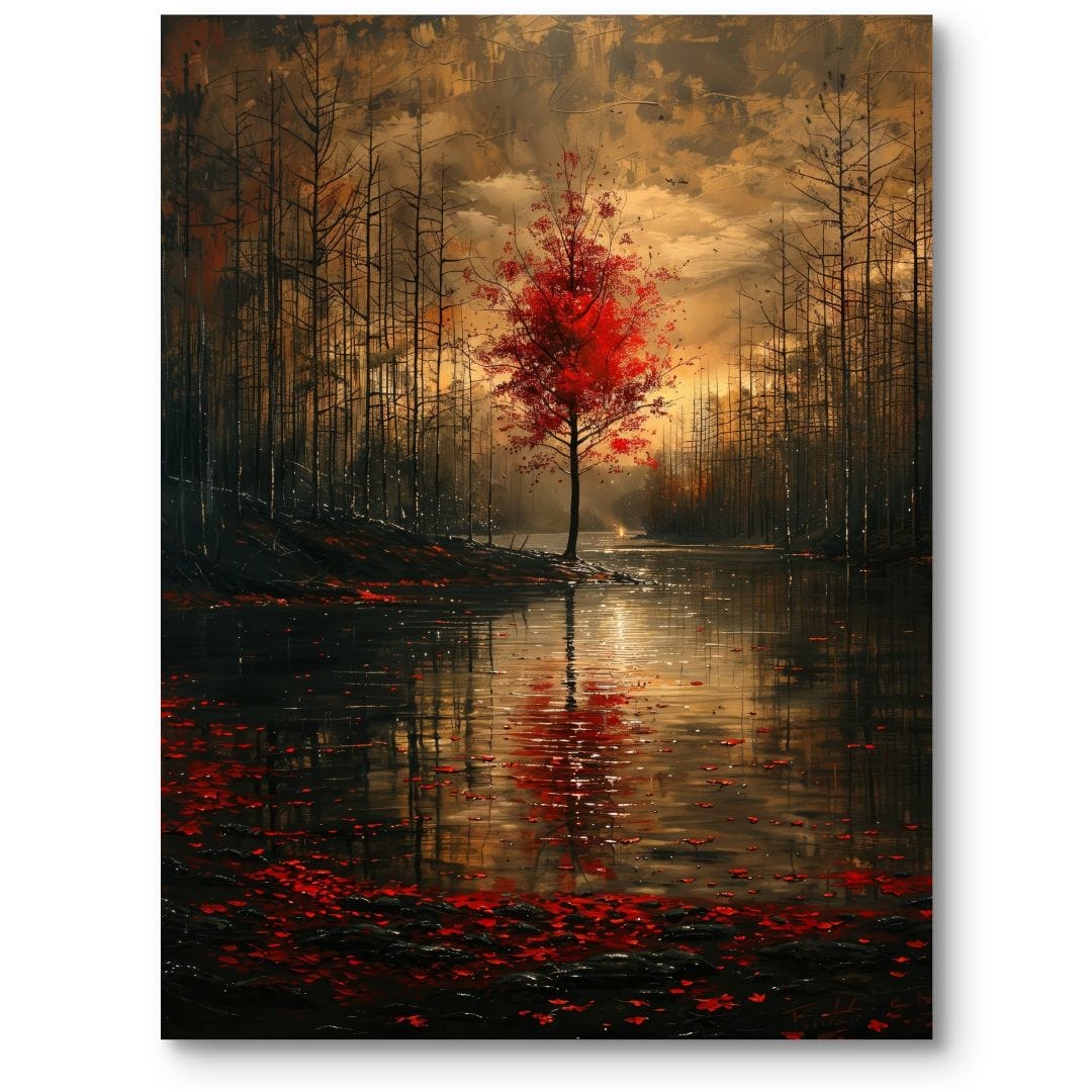 Czerwone drzewo, umieszczone centralnie, przyciąga wzrok i staje się dominującym akcentem całego obrazu. Ciepłe światło rozlewające się w tle buduje atmosferę głębi i spokoju. Paleta barw oparta na odcieniach czerwieni, brązu i czerni nadaje kompozycji elegancji oraz wyjątkowego charakteru.