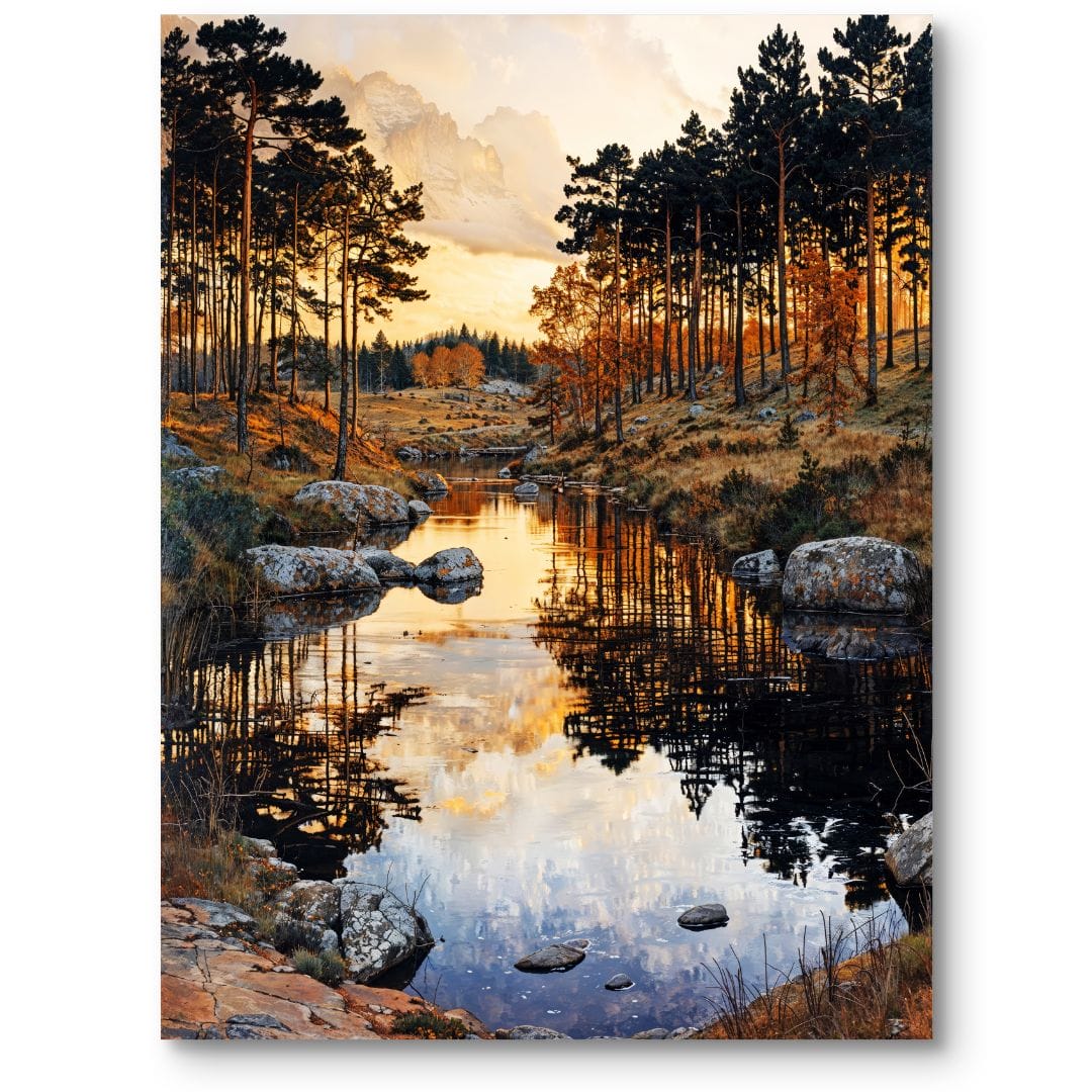 Ten urzekający obraz na płótnie przedstawia spokojny jesienny krajobraz, w którym rzeka subtelnie meandruje przez malowniczą, leśną dolinę. Otulone ciepłymi barwami drzewa i kamienie tworzą harmonijną całość, oddając niezwykłe piękno natury w pełni jej okazałości. W tle majestatyczne góry przydają scenerii głębi i nuty tajemniczości. Ten obraz, będąc połączeniem elementów takich jak rzeka, drzewa, kamienie i górskie szczyty, zachwyca naturalnością i przemyślaną kompozycją.