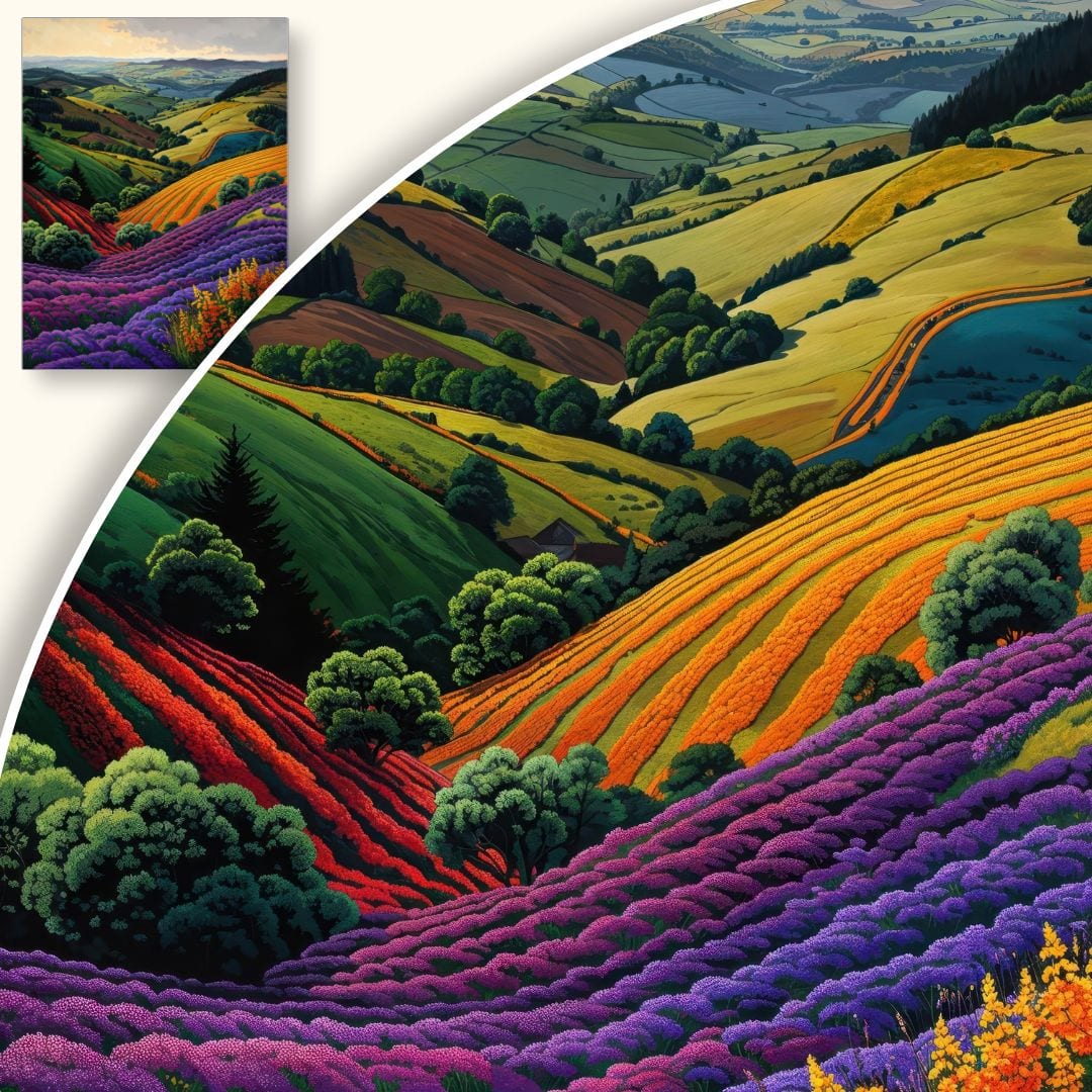 Ten obraz na płótnie zachwyca bogactwem kolorów i subtelną grą świateł. Na pierwszym planie intensywne, fioletowe kwiaty przyciągają wzrok, przechodząc płynnie w paletę zieleni, pomarańczy i czerwieni. W tle rozciągają się łagodne wzgórza, lasy oraz doliny, tworząc nastrojową, pełną harmonii scenerię, która koi zmysły.