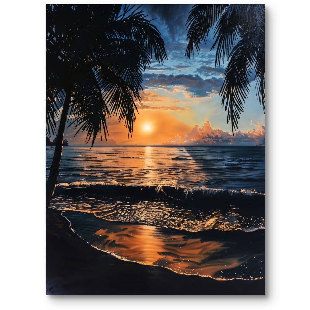 Obraz ukazuje zachwycający krajobraz nadmorski, gdzie na pierwszym planie delikatnie kołyszą się palmy, tworząc naturalną ramę dla całej kompozycji. Centrum dzieła stanowi spektakularny zachód słońca, którego ciepłe barwy efektownie odbijają się w spokojnych wodach oceanu. W tle rozciągają się miękkie chmury, dodające głębi, nostalgii i lekko dramatycznego charakteru scenie.