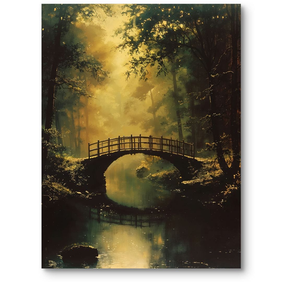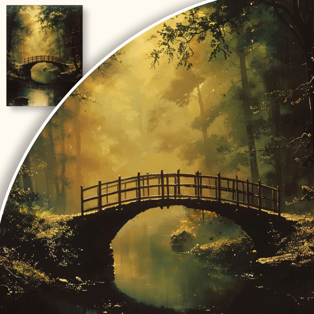 Centralnie umieszczony most przyciąga wzrok, a subtelnie padające światło z tła buduje aurę spokoju i magii. Paleta barw łączy zielenie, głębokie czernie oraz ciepłe, złote odcienie, które nadają kompozycji harmonijny, przytulny nastrój.