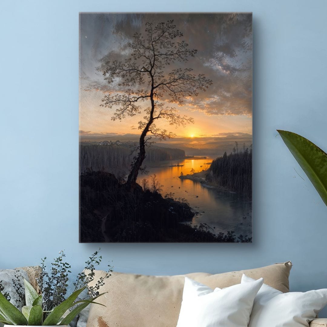 Obraz wprowadza do wnętrza aurę wyciszenia i odprężenia. Drzewo na skale jest metaforą nieugiętości i siły natury, a wschód słońca dodaje energii, obiecując nowe początki i rodzące się nadzieje.