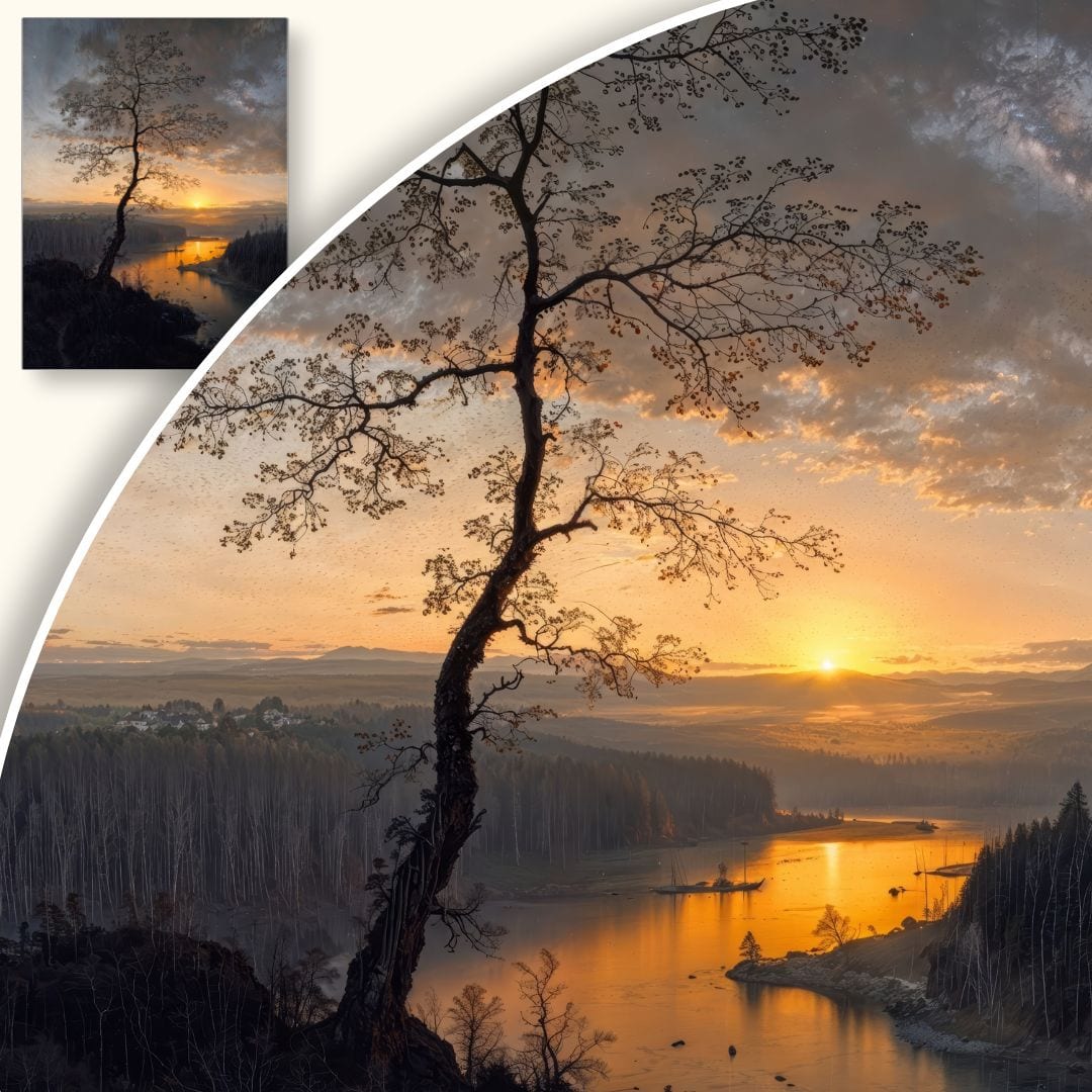 Obraz ukazuje niezwykłe piękno wschodu słońca nad spokojnym jeziorem, widzianym z malowniczego wnętrza lasu. Centralną postacią kompozycji jest smukłe drzewo wyrastające ze skalistego podłoża – subtelny symbol siły oraz wytrwałości natury.