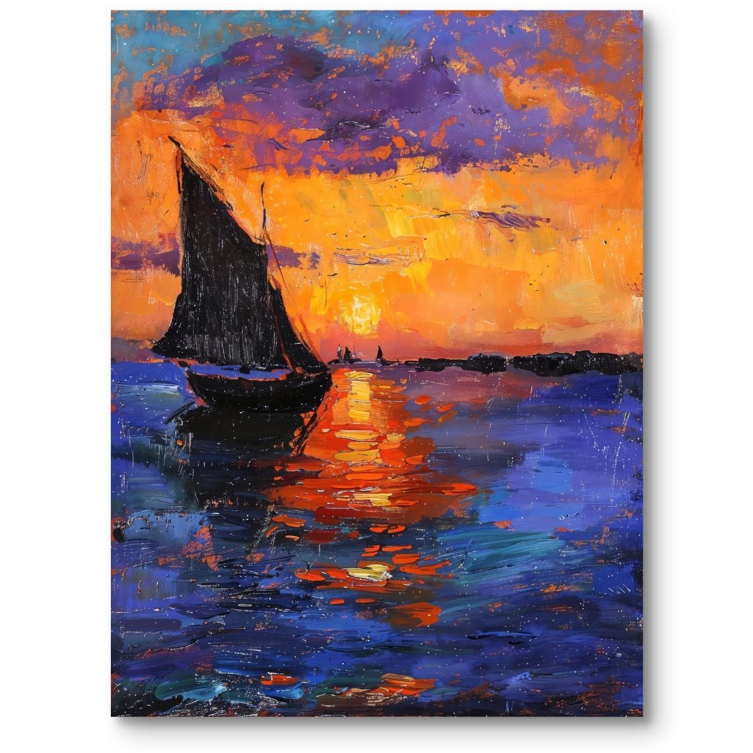 Centralnie umieszczona żaglówka przyciąga wzrok, stanowiąc serce całości. Promienie słoneczne rozświetlają wodę ciepłymi, intensywnymi barwami – żółciami, oranżami i subtelnymi fioletami – współgrając z chłodnymi błękitami. Urokliwy kontrast tworzy wrażenie ruchomego światła i potęguje głębię sceny.