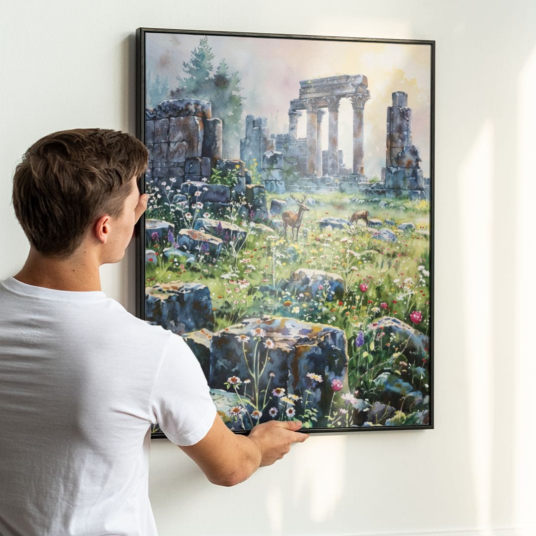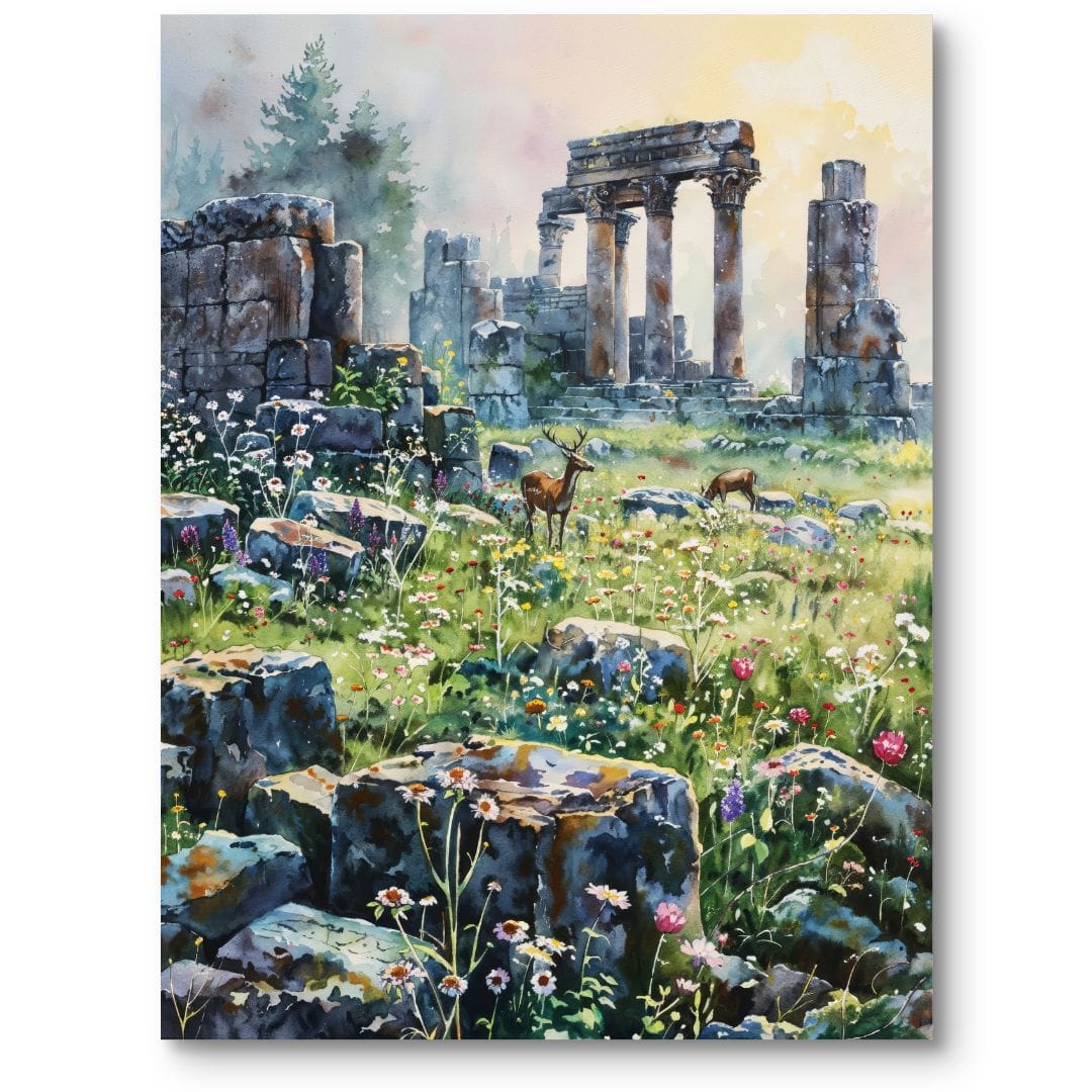 Obraz na płótnie ukazuje malowniczy krajobraz ruin antycznej świątyni, otoczony rozkwitającą łąką, po której przechadzają się dostojne jelenie. Kompozycja przywodzi na myśl harmonię pomiędzy bogactwem natury a tajemnicami historii, jednocześnie podkreślając zjawiskowe piękno zarówno fauny, jak i zabytkowych struktur.