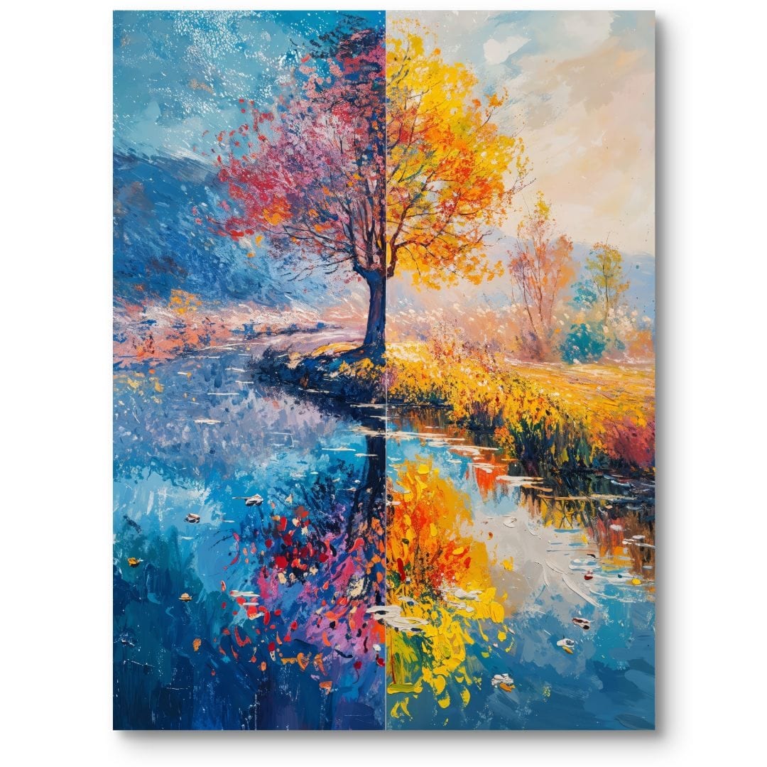 Obraz zachwyca niezwykłym krajobrazem, którego centrum stanowi majestatyczne drzewo ozdobione wielobarwnymi liśćmi. Kompozycja dzieła rozdzielona została na dwie wyraziste części – jedna ukazuje rozgrzewający, jesienny pejzaż pełen złocistych, pomarańczowych tonów, druga natomiast emanuje spokojem chłodnych barw w odcieniach błękitu i zieleni, nawiązując do różnych pór roku. U stóp drzewa rozciąga się spokojne jezioro, którego tafla lśni i odbija paletę barw otaczającej, majestatycznej natury.