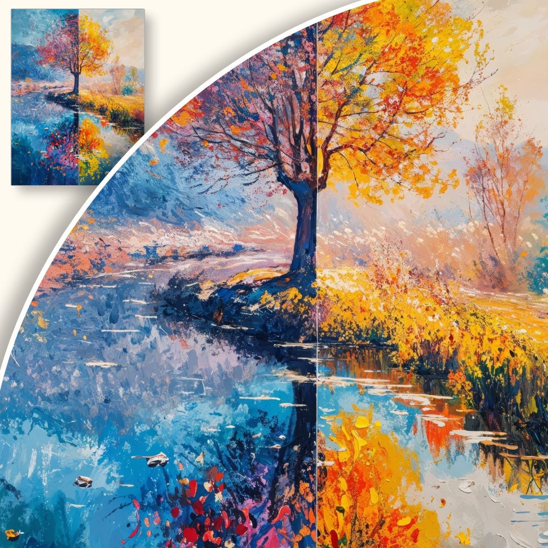 Impresjoniści, chcąc wiernie oddać zmienność natury, często malowali ten sam motyw w różnych porach dnia lub porach roku. Ten obraz nawiązuje do tej idei, przedstawiając kontrastujące pejzaże w jednym kadrze, co czyni go niezwykle oryginalną ozdobą wnętrza.