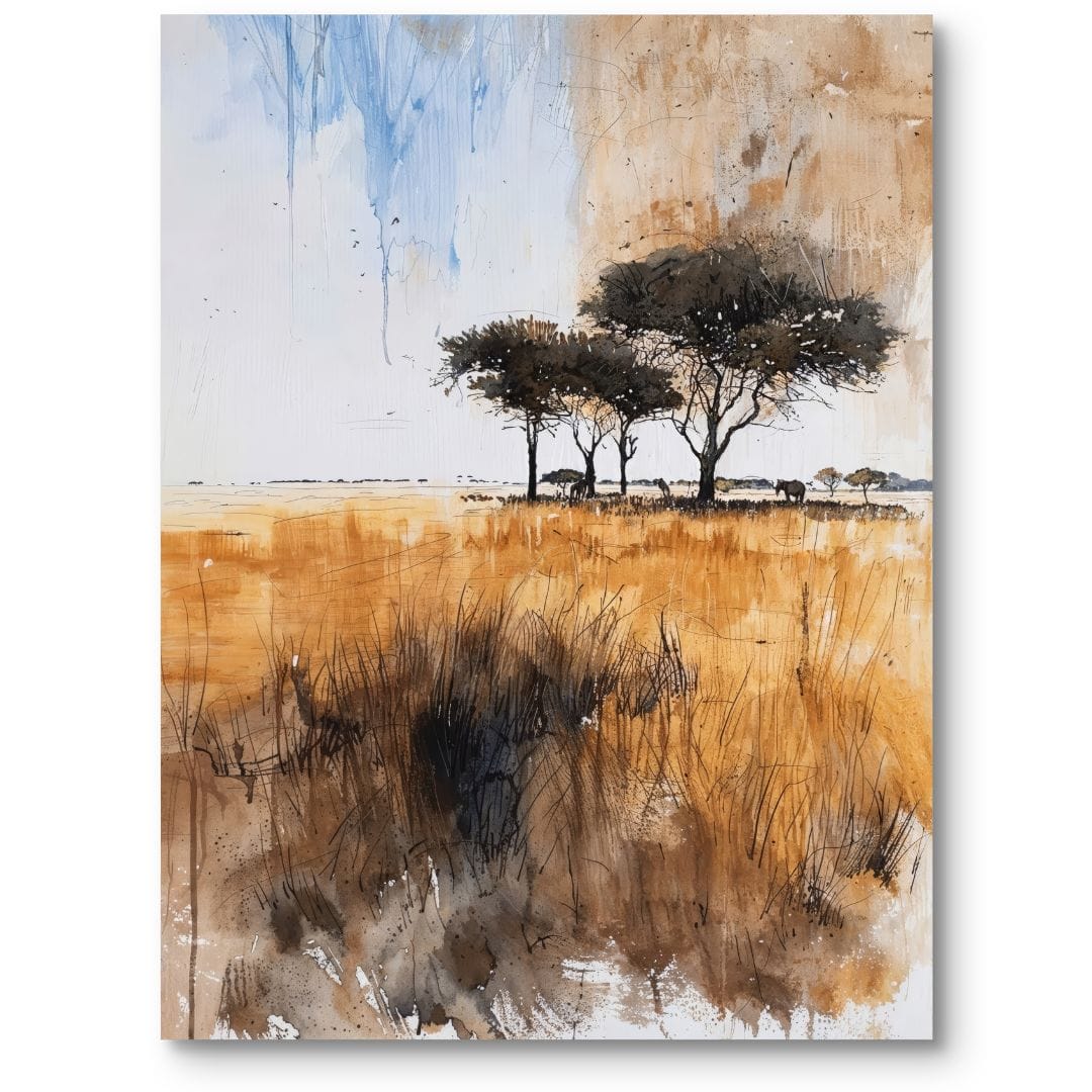 Obraz na płótnie przedstawia malowniczy, spokojny krajobraz sawanny, gdzie kilka majestatycznych drzew rozpościera swe korony na otwartej przestrzeni. W oddali widoczna jest subtelna linia horyzontu, która wprowadza do kompozycji wrażenie głębi i nieograniczonej przestronności.