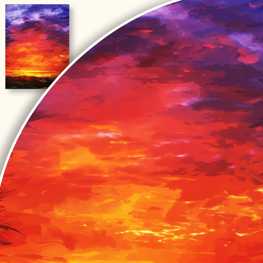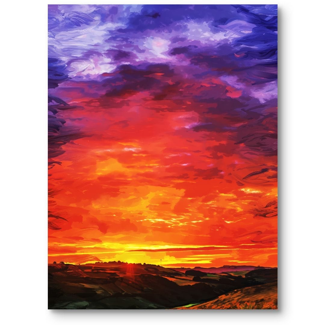 Obraz na płótnie przedstawia urzekający krajobraz o zachodzie słońca. Nasycone barwy czerwieni, pomarańczu oraz głębokiego fioletu rozświetlają niebo pełne ekspresyjnych chmur, tworząc hipnotyzujący spektakl kolorów i emocji. Ta kompozycja zachwyca wyjątkowym oddaniem ulotnych chwil i magii codzienności, zapraszając do zanurzenia się w ukojenie i kontemplację piękna otaczającego nas świata.