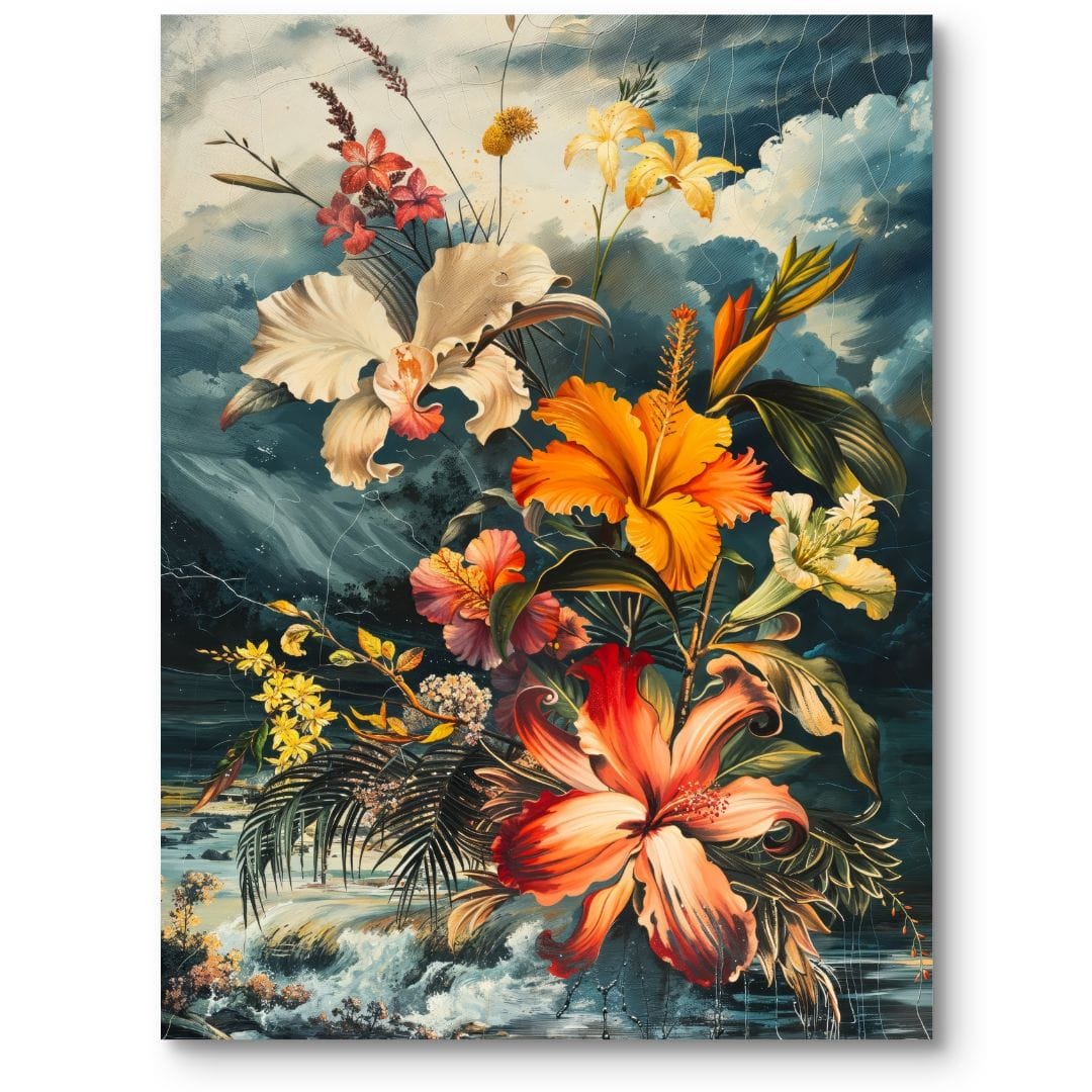 Obraz na płótnie ukazuje zachwycającą kompozycję, w której pierwsze skrzypce grają egzotyczne orchidee i delikatne lilie. Ukwiecone motywy otulone są bujną zielenią, wprowadzając do wnętrza powiew świeżości oraz wyrazistą energię. Tłem dla tej sugestywnej sceny jest pełna dynamiki natura – niebo z poruszającymi się chmurami oraz subtelne podmuchy wiatru, które budują kontrast i głębię obrazu.