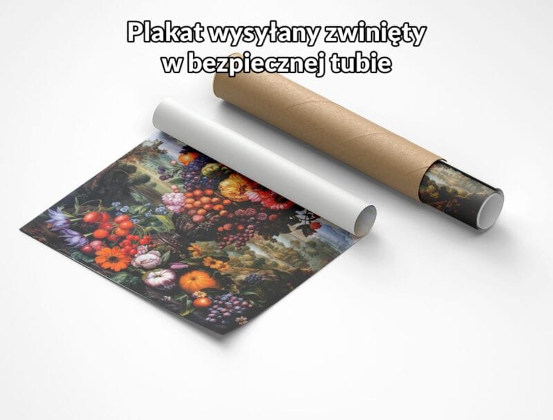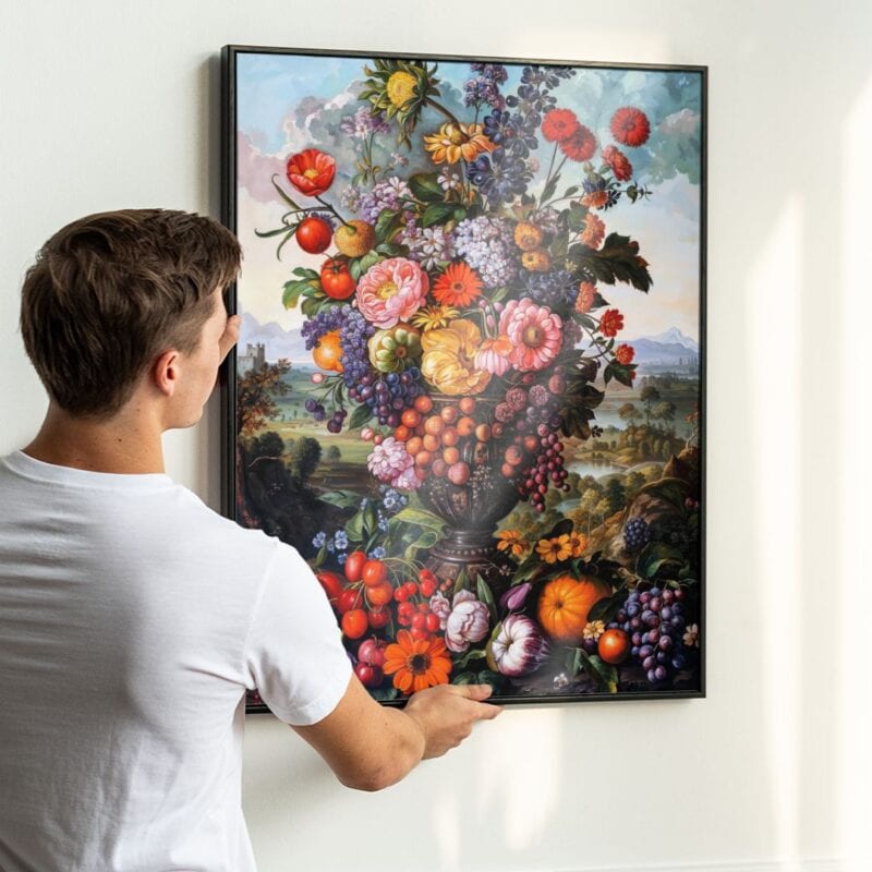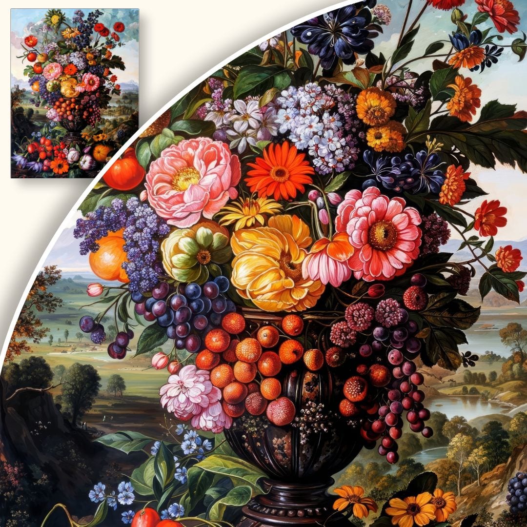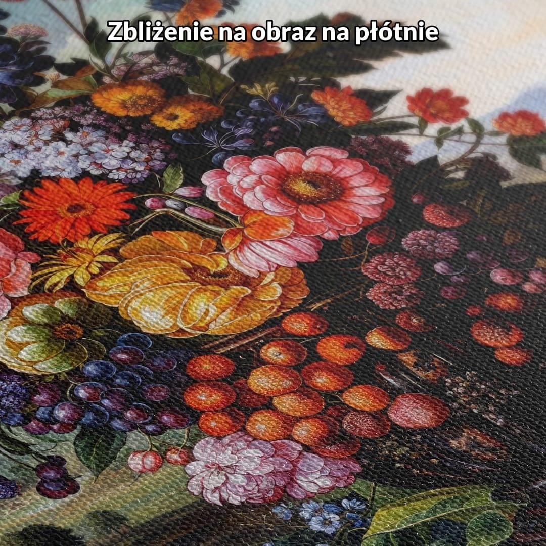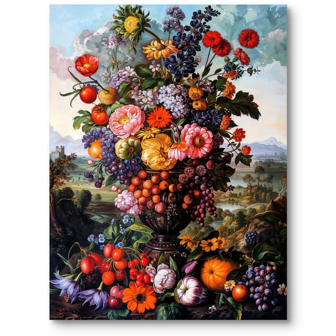 Obraz na płótnie ukazuje misternie zdobiony wazon wypełniony różnorodnymi kwiatami i owocami, tle którego rozpościera się malowniczy krajobraz. Ta pełna bogactwa scena przywodzi na myśl mistrzowskie martwe natury rodem z holenderskiego baroku. Każdy detal – od soczystych gron winogron po subtelne płatki kwiatów – został wiernie oddany z niezwykłą precyzją i troską o szczegóły.