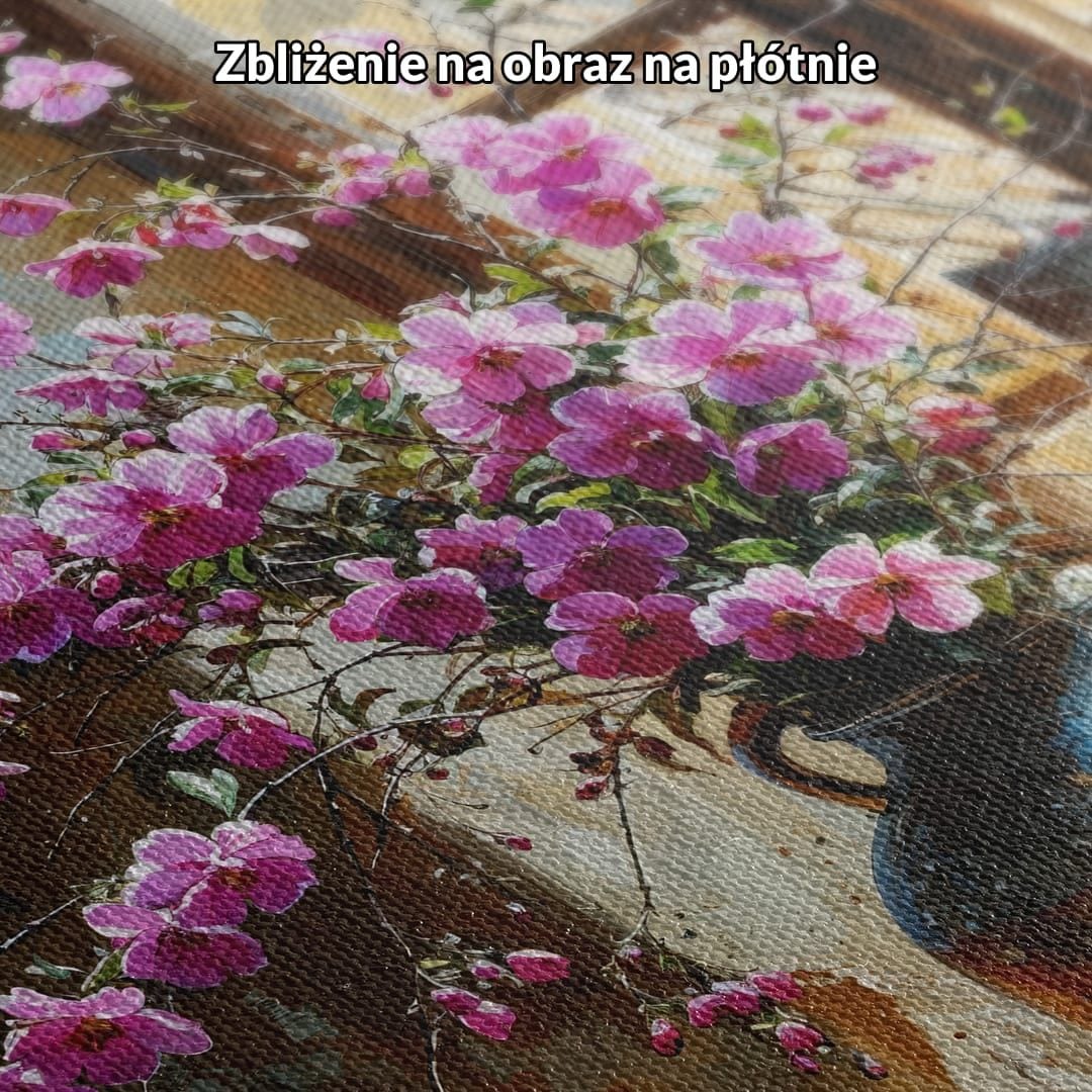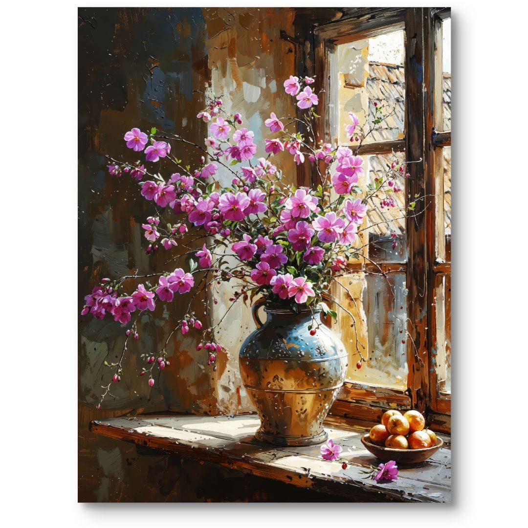 Obraz na płótnie przedstawia nastrojową scenę z wazonem różowych kwiatów, umieszczonym na szerokim parapecie okna. Kwiaty rozkwitają na tle subtelnie zarysowanego wnętrza w ciepłych, brązowych tonacjach, emanując spokojem i naturalnym pięknem. Obok wazonu znajduje się miska pełna owoców, która dopełnia kompozycję, nadając całości subtelną elegancję charakterystyczną dla klasycznej martwej natury.
