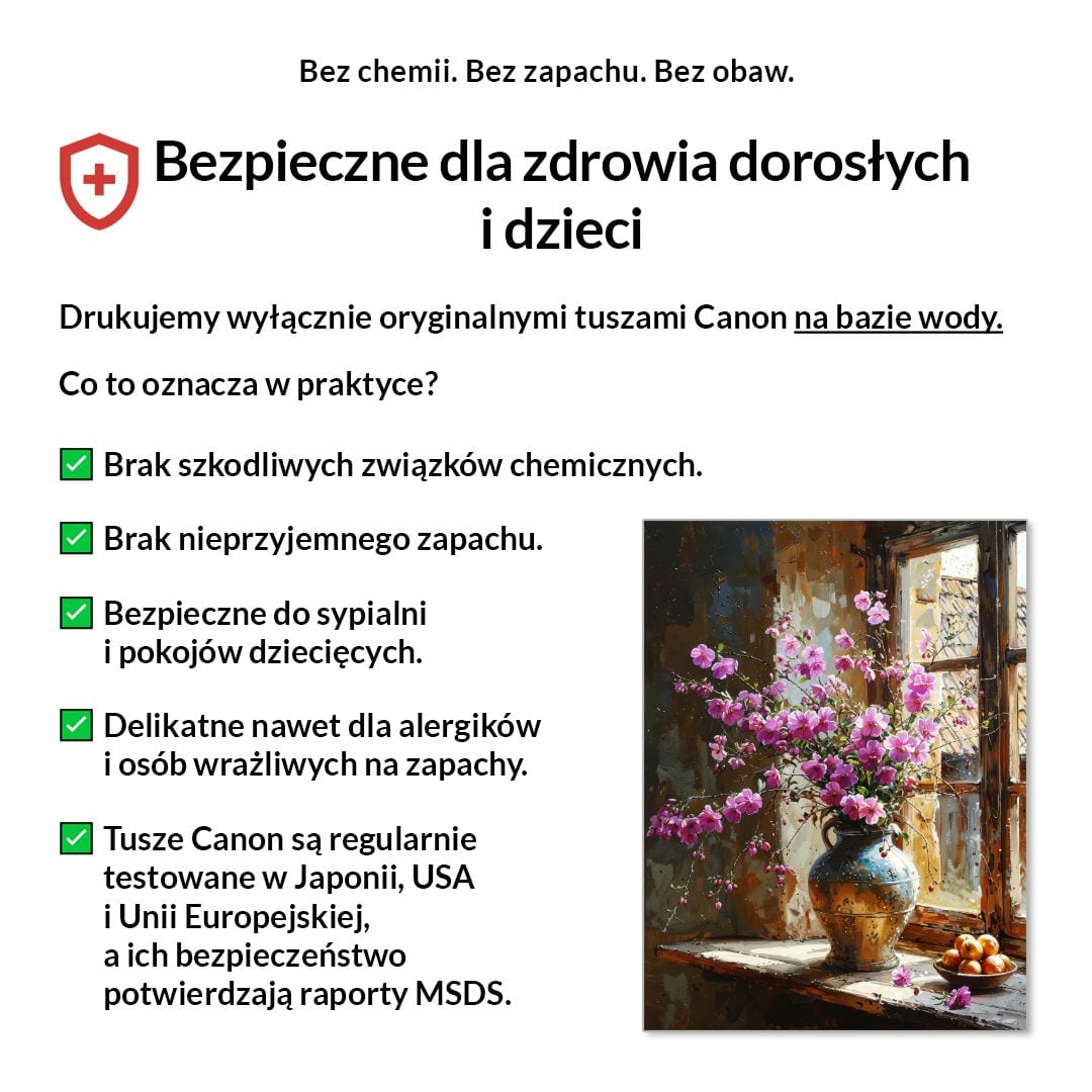 My drukujemy wyłącznie na pigmentowych tuszach Canon LUCIA PRO, bezpiecznych, bezzapachowych i certyfikowanych.