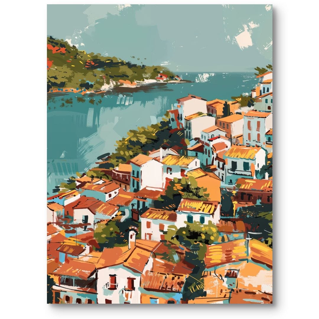 Obraz na płótnie prezentuje niezwykle malowniczy widok nadmorskiego miasteczka – kolorowe domy pną się ku błękitnemu niebu, rozświetlone słońcem i otulone spokojem lazurowej tafli morza. Kompozycja tętni światłem i życiem: soczyste pomarańczowe dachy kontrastują z gęstą zielenią roślin oraz turkusową wodą, tworząc harmonijny, a zarazem energetyczny krajobraz.
