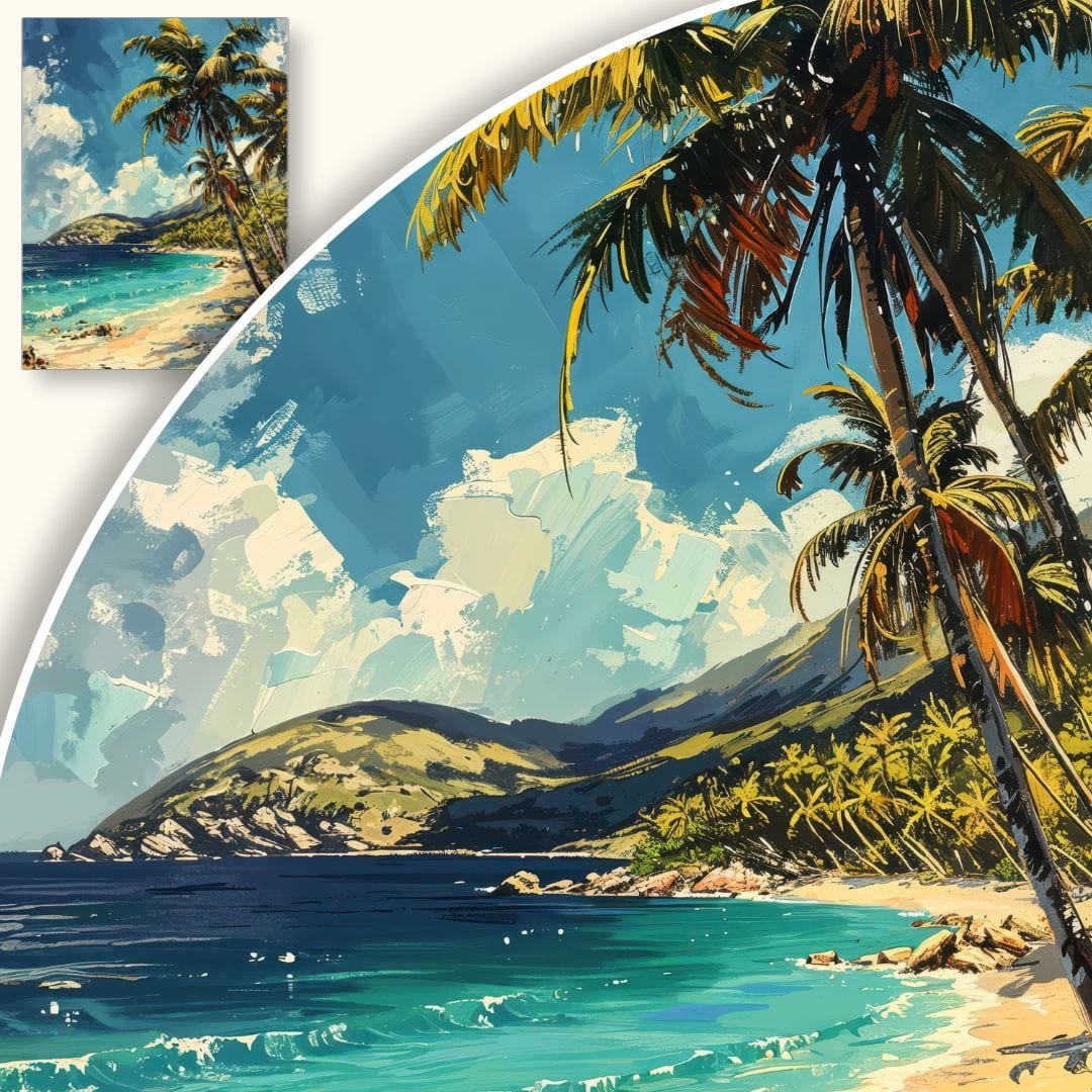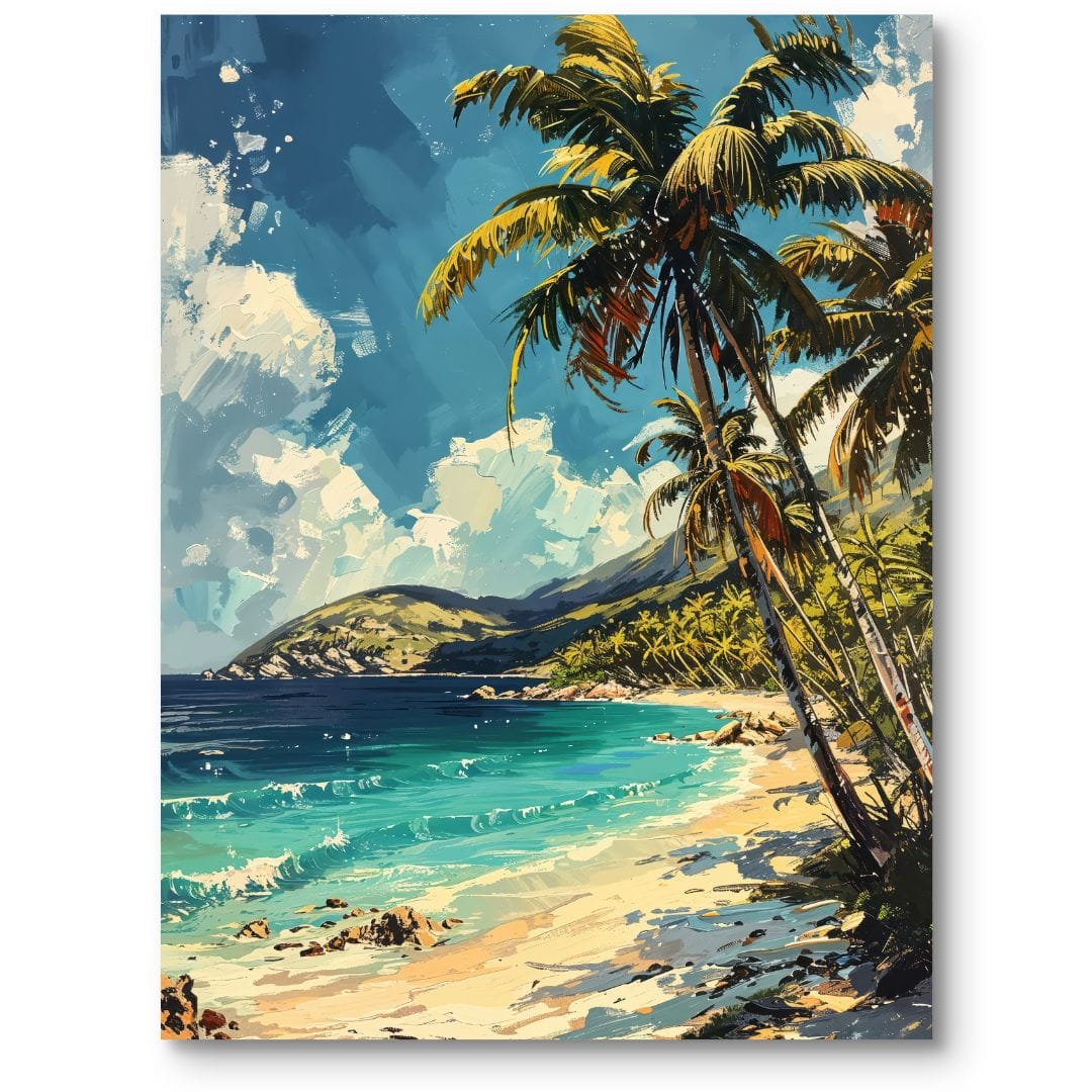 Obraz na płótnie ukazuje zachwycający, tropikalny pejzaż: rozświetloną słońcem plażę z majestatycznymi palmami, lazurowym morzem oraz subtelnymi wzgórzami w oddali. To wizja, która od razu przywodzi na myśl leniwe popołudnia, szum fal i uczucie beztroski na rajskiej wyspie. Dominującymi motywami są tutaj natura i krajobraz – z palmami nadającymi kompozycji egzotyczny, letni wymiar.