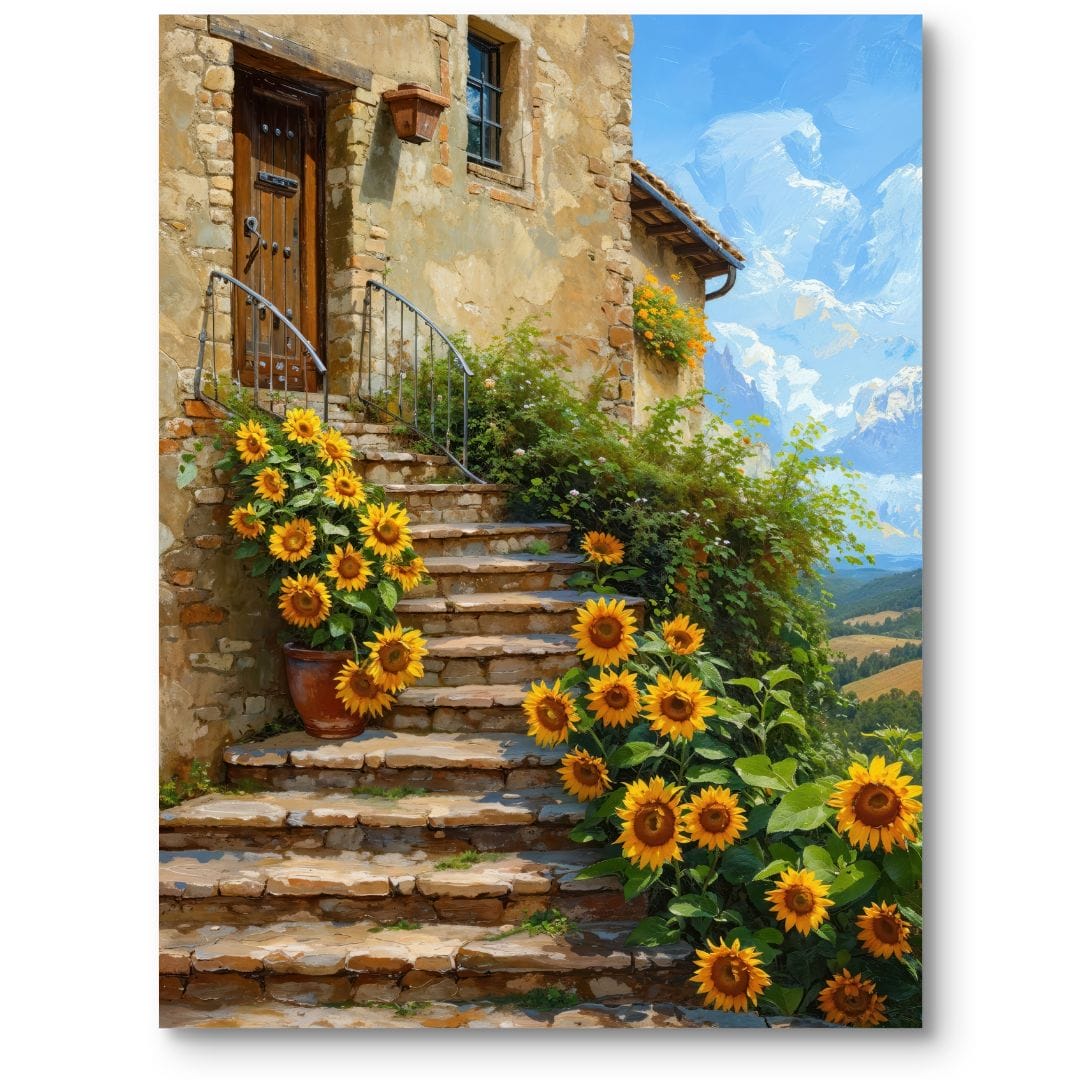 Ten obraz na płótnie ukazuje malowniczy, kamienny wiejski dom, do którego prowadzą ozdobione żółtymi słonecznikami schody. Otoczenie tworzy zapierający dech w piersiach krajobraz górski z łagodnie błękitnym niebem w tle. Kompozycja przenosi nas myślami w beztroskie, letnie dni spędzane na łonie przyrody, budząc nostalgię za spokojem i harmonią wiejskiego życia.