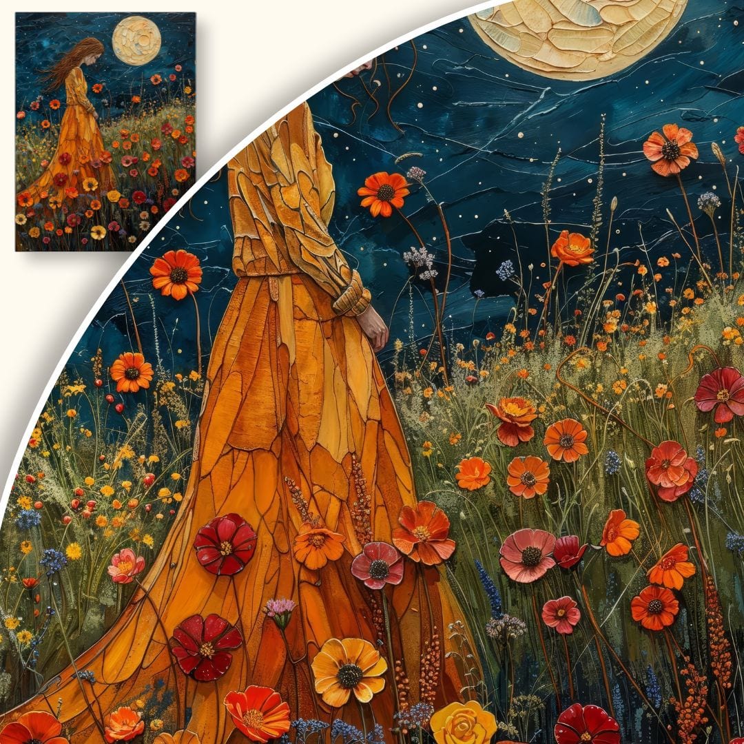 Obraz na płótnie ukazuje młodą kobietę w długiej, pomarańczowej sukni, spacerującą po rozświetlonej księżycem łące pełnej kwiatów. Na tle nocy pojawia się efektowny, pełny księżyc, który nadaje całej scenie wyjątkowo magiczny charakter. Kompozycja jest inspirowana spokojem i nostalgią cichych, nocnych krajobrazów, w których natura i cisza otulają wszystko wokół subtelną aurą tajemnicy.