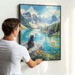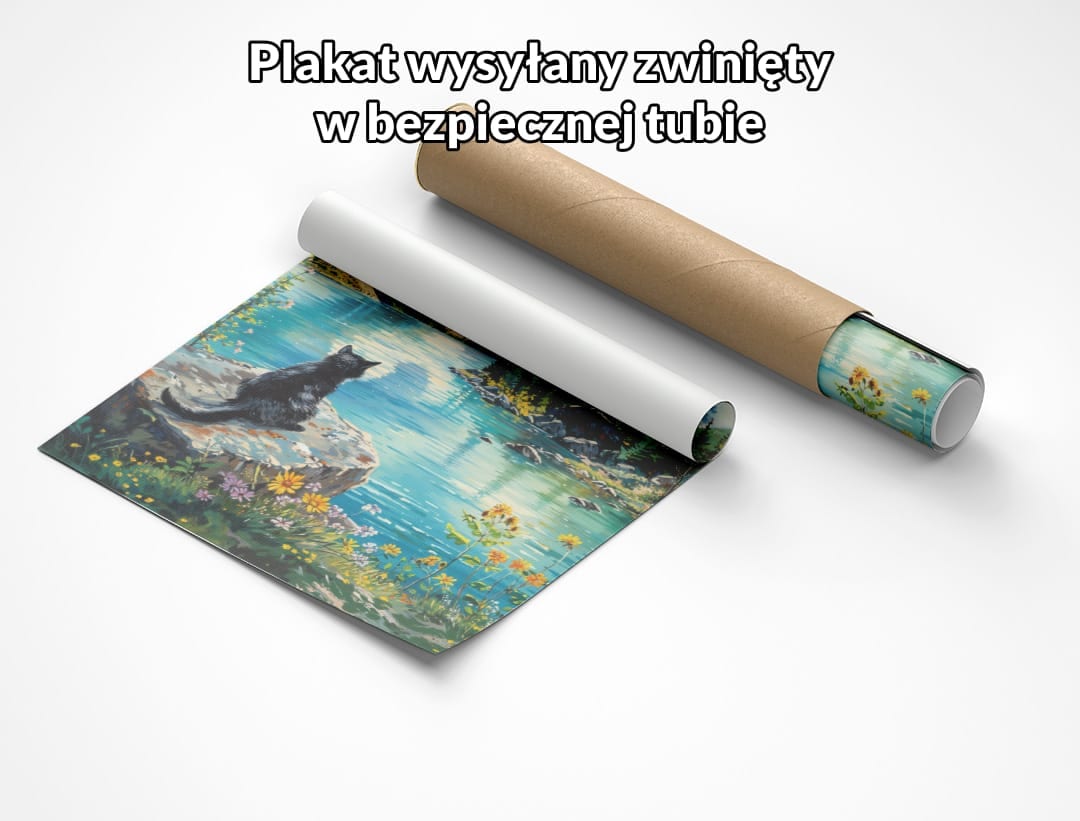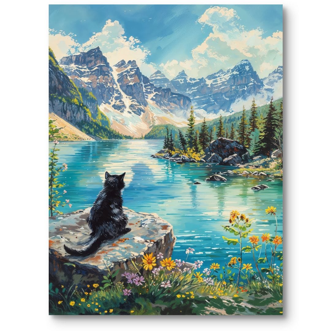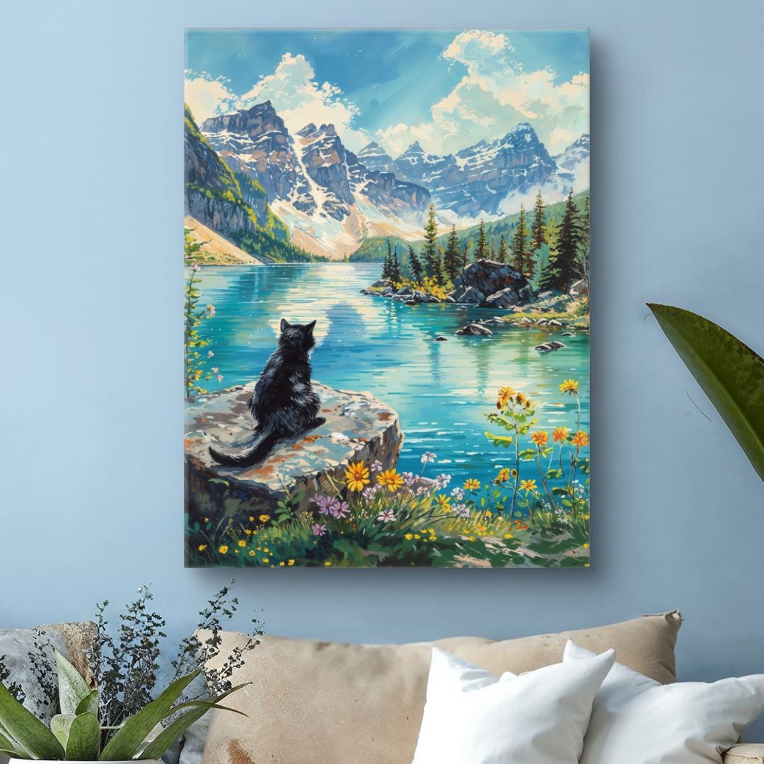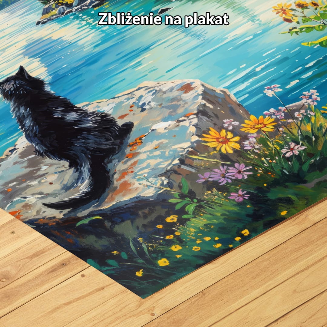 Obraz na płótnie przenosi nas do malowniczego górskiego krajobrazu, którego sercem jest spokojne jezioro. Na pierwszym planie siedzi czarny kot, spoglądający zamyślonym wzrokiem w dal, otulony paletą barwnych kwiatów i dzikiej roślinności. W tle dostrzec można majestatyczne szczyty gór oraz soczystą zieleń lasu okalającego taflę jeziora, co wprowadza do dzieła elementy świeżości i głębi.