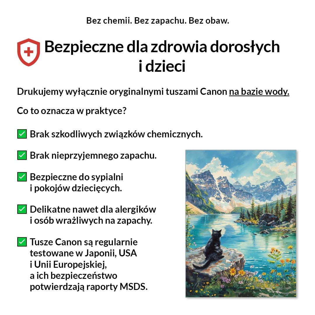 Tak, absolutnie! Drukujemy wyłącznie certyfikowanymi, bezwonnymi tuszami pigmentowymi Canon Lucia Pro na bazie wody. Są one w pełni bezpieczne dla zdrowia, nie zawierają rozpuszczalników i mogą być bez obaw stosowane w sypialniach i pokojach dziecięcych.