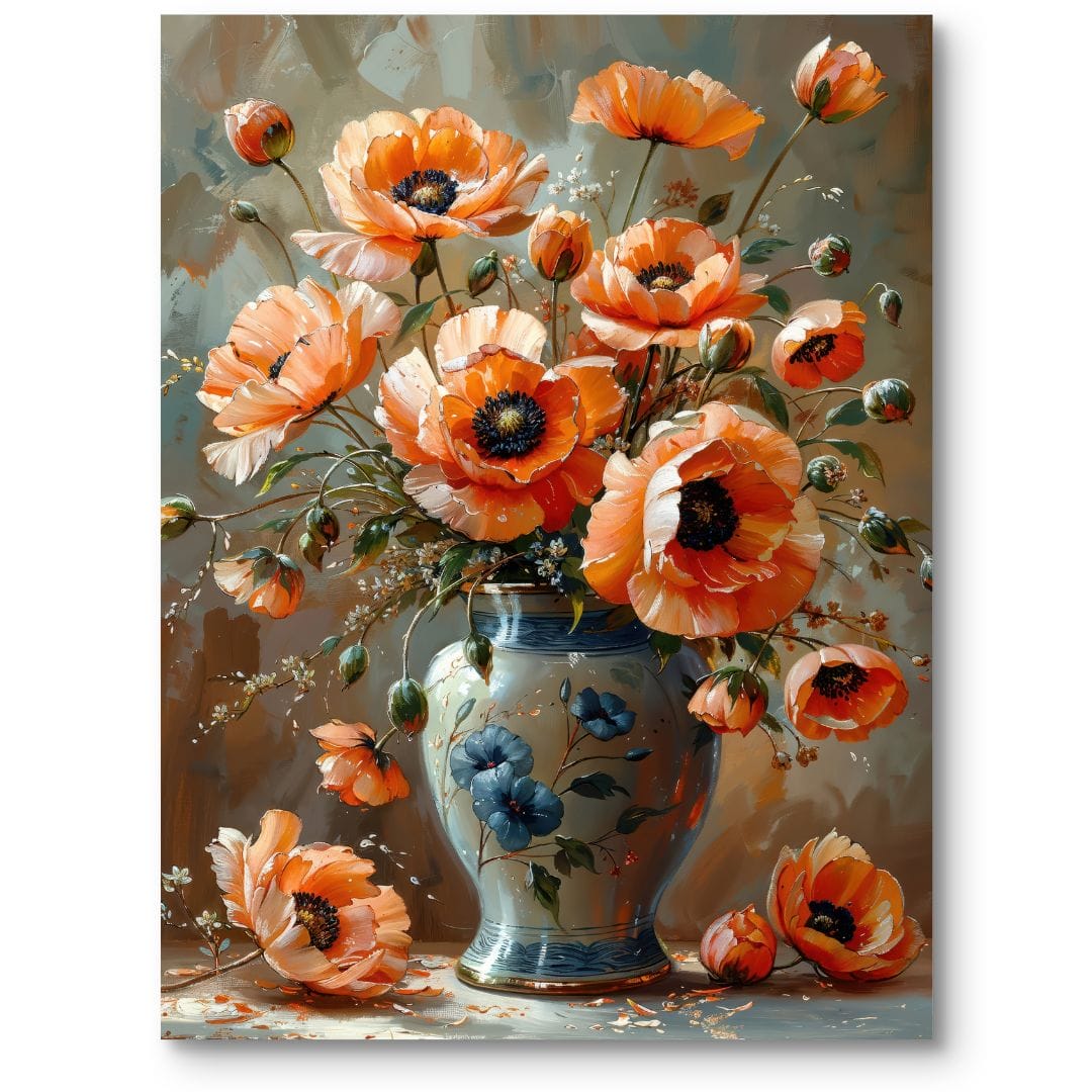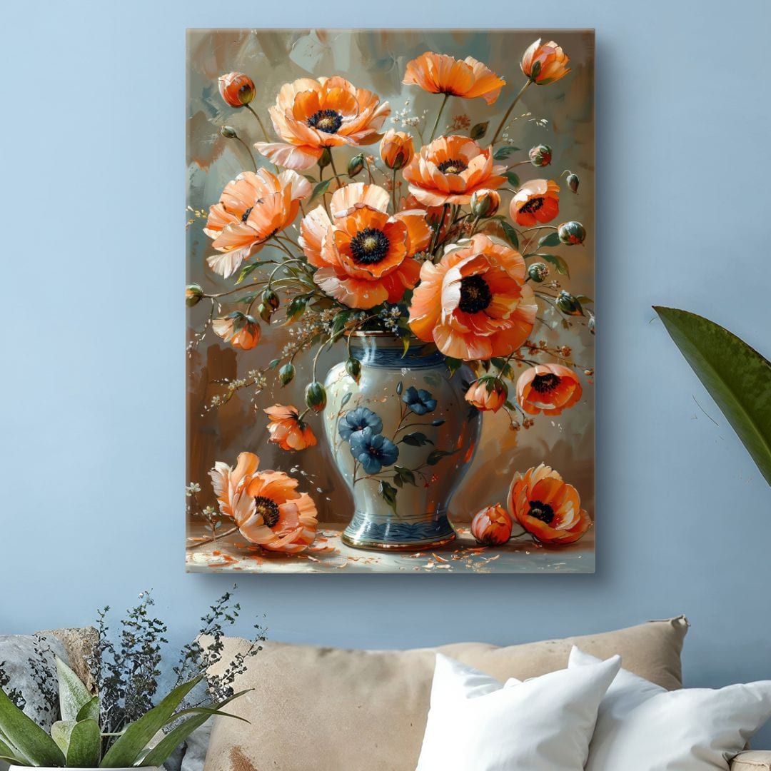 Obraz na płótnie ukazuje zniewalającą kompozycję pomarańczowych maków, efektownie prezentujących się w stylowym, zdobionym wazonie. Każdy płatek i detal roślin zostały oddane z niezwykłą precyzją, co podkreśla naturalną urodę kwiatów. Delikatne tło w odcieniach zieleni i błękitu tworzy kontrast, który wydobywa głębię barw, a całość kompozycji tchnie świeżością oraz harmonią natury.