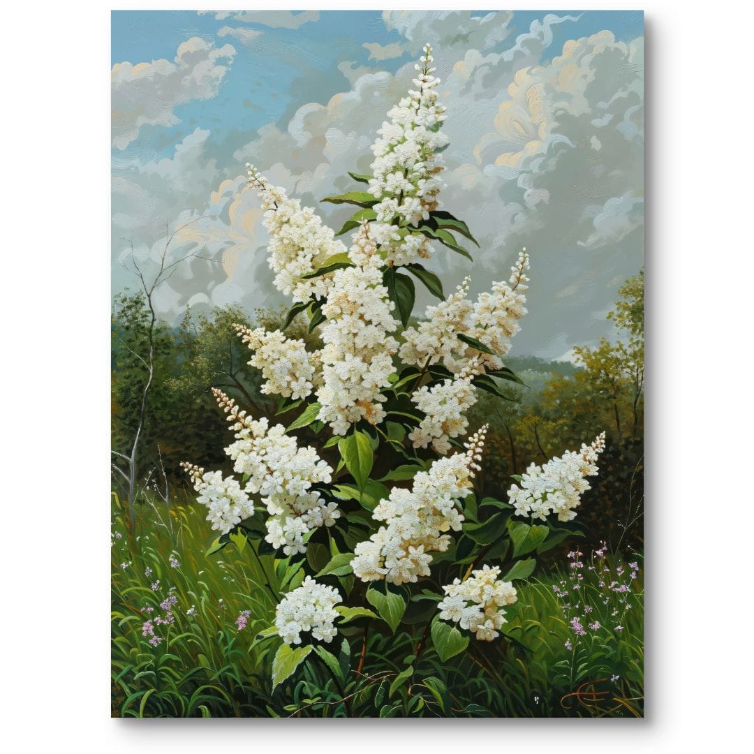 Obraz przedstawia zachwycającą, realistyczną gałąź rozkwitającej rośliny. Białe kwiaty w pełni rozkwitu przeplatają się z soczystą zielenią liści, tworząc harmonijną kompozycję osadzoną na tle bujnej natury, z błękitnym niebem ozdobionym subtelnymi obłokami.