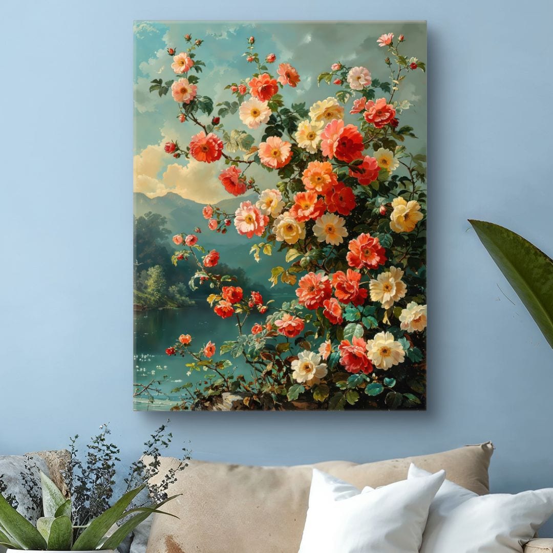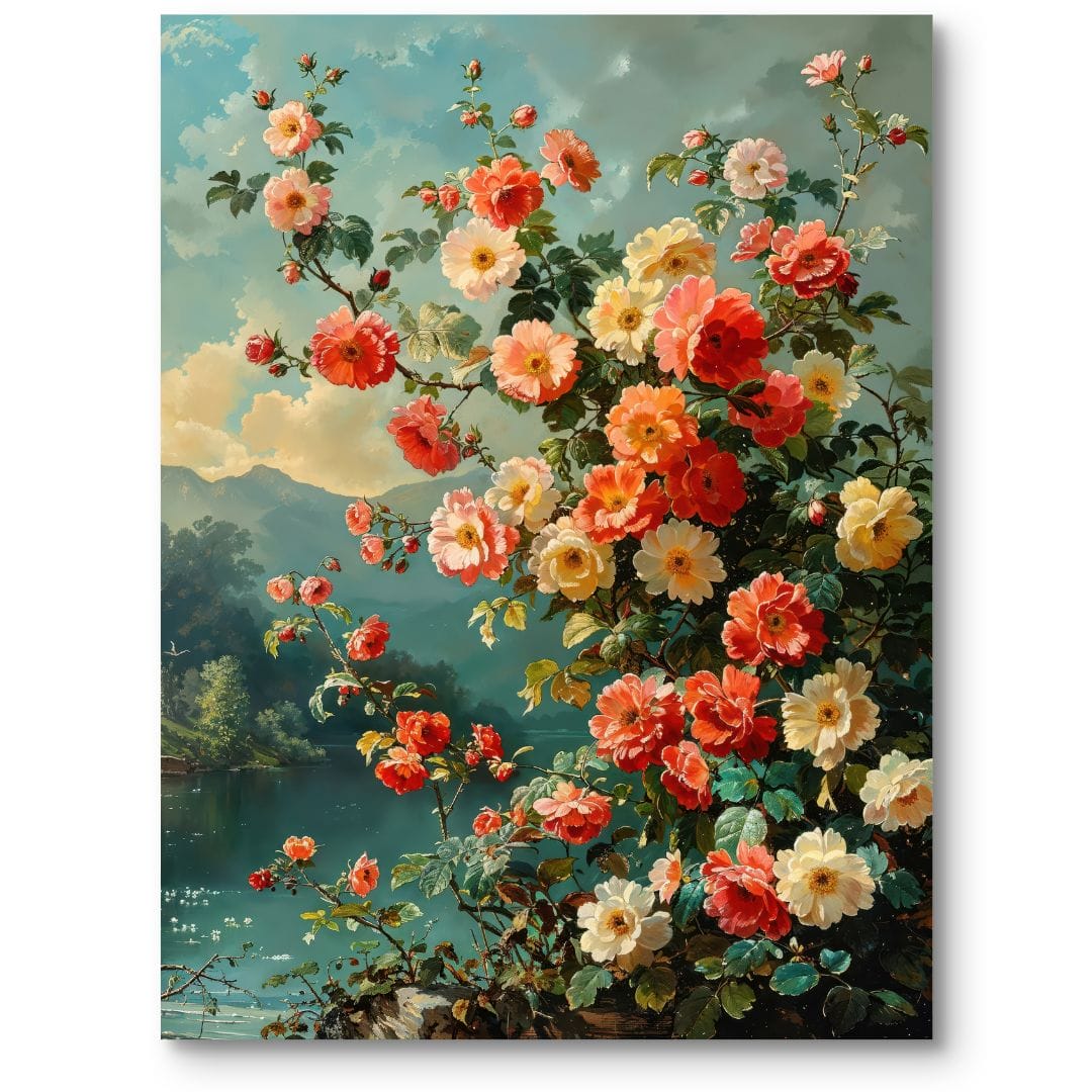 Obraz na płótnie przedstawia zachwycające, intensywnie kolorowe róże kwitnące tuż przy brzegu spokojnego jeziora. W tle rozpościerają się majestatyczne góry oraz rozświetlone, błękitne niebo z subtelnymi obłokami. Centralna kompozycja kwiatów oraz bogactwo barw i szczegółów nadają dziełu niezwykły realizm i głębię, przyciągając wzrok każdego odbiorcy.