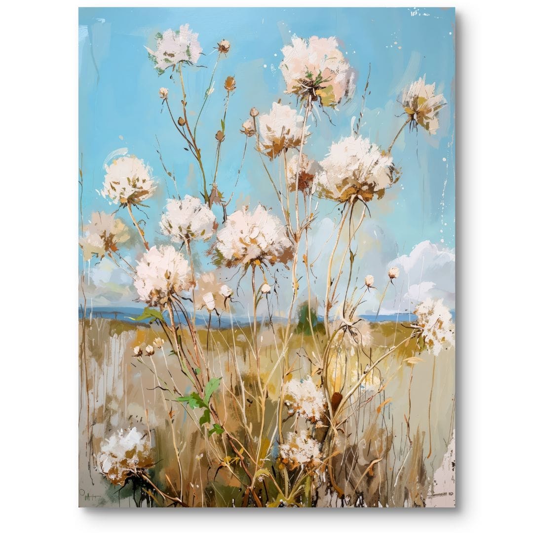 Barwy na płótnie przeplatają się harmonijnie – czysta biel kwiatów, soczysta zieleń traw i głęboki błękit nieba wspólnie budują wrażenie świeżości oraz spokoju. Światło zostało namalowane miękko, dzięki czemu subtelnie podkreśla piękno i subtelność kwiatów, wzmacniając sielski charakter dzieła.