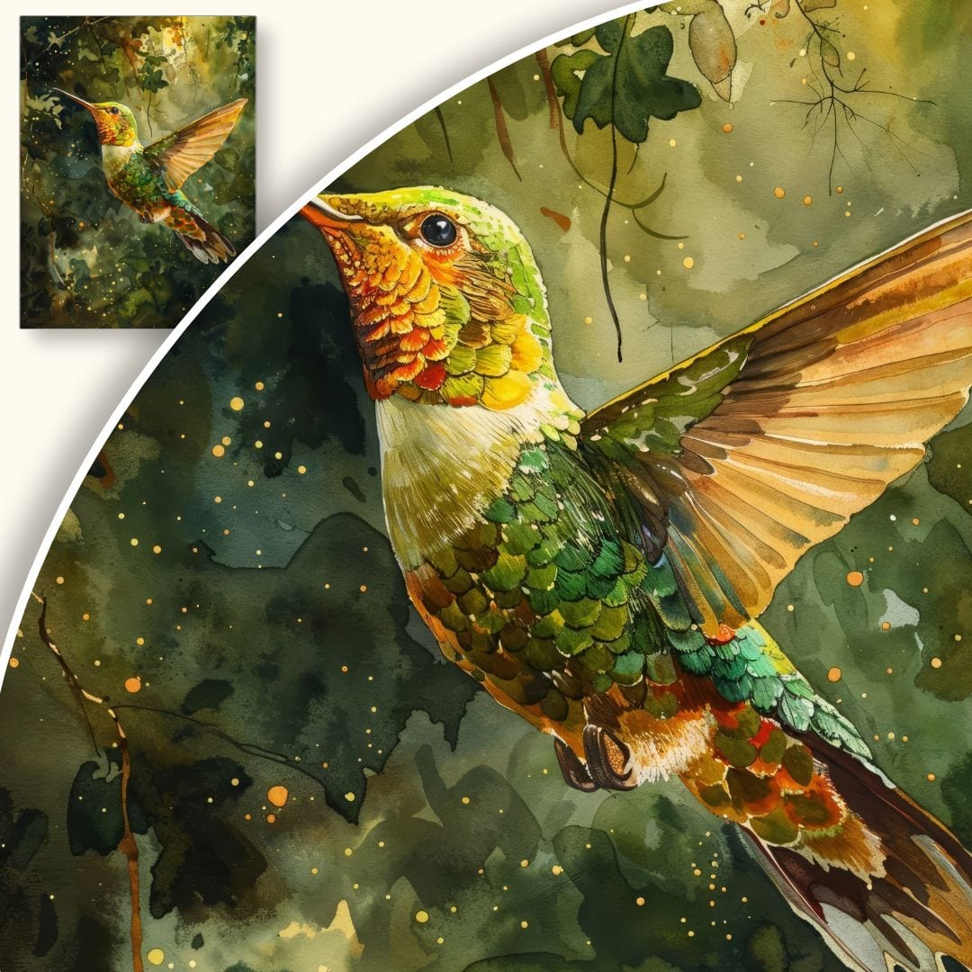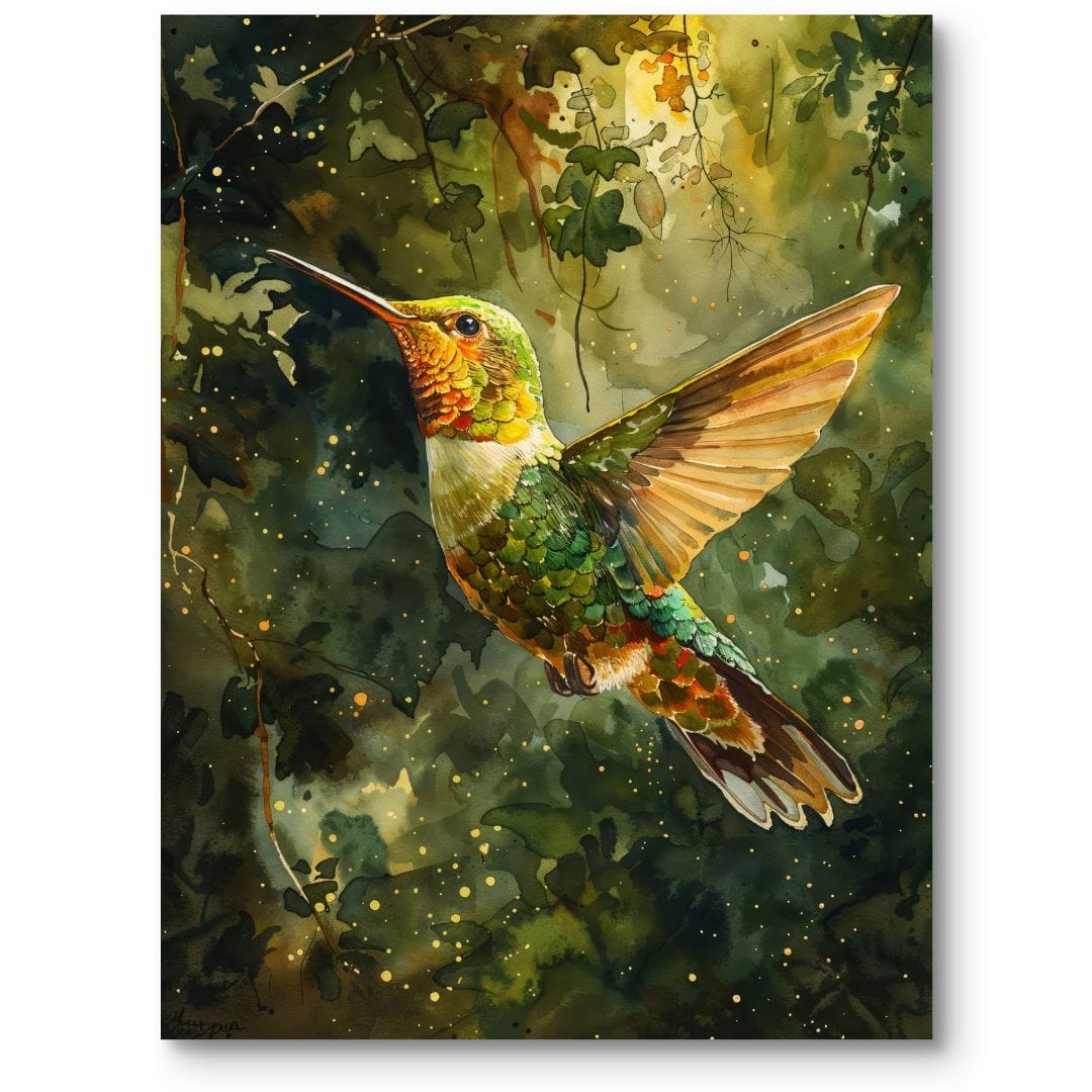 Centralna postać obrazu – barwny koliber – pięknie kontrastuje z miękką zielenią tła. Promienie światła przenikające przez liście roztaczają ciepły, bajeczny klimat oraz wydobywają detale upierzenia ptaka. Dominują zielenie, pomarańczowe i żółte akcenty, które współgrają ze sobą, nadając kompozycji pogodny, pozytywny charakter.