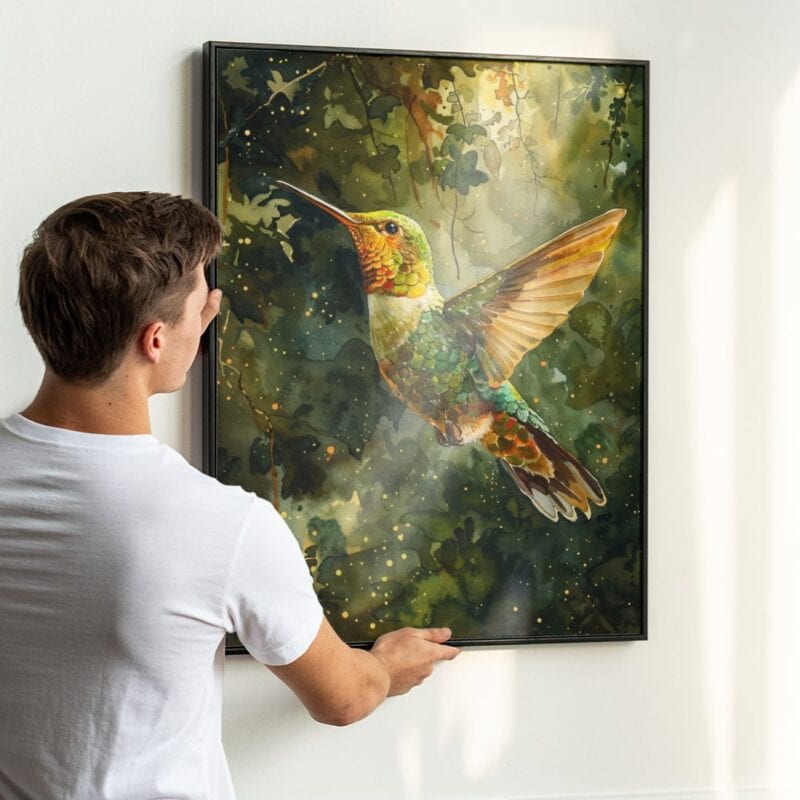 Obraz z kolibrem doskonale uzupełni zarówno klasyczne, jasne wnętrza, jak i te urządzone w duchu boho czy urban jungle. Świetnie komponuje się z naturalnymi materiałami, drewnem oraz zielonymi roślinami doniczkowymi. Warto umieścić go w widocznym miejscu, aby stał się centralnym punktem dekoracyjnym – nad sofą, w sypialni nad łóżkiem lub w domowym gabinecie, gdzie doda lekkości i inspirującego klimatu.