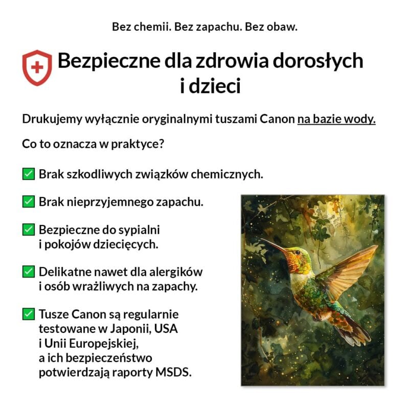 Tak, absolutnie! Drukujemy wyłącznie certyfikowanymi, bezwonnymi tuszami pigmentowymi Canon Lucia Pro na bazie wody. Są one w pełni bezpieczne dla zdrowia, nie zawierają rozpuszczalników i mogą być bez obaw stosowane w sypialniach i pokojach dziecięcych.