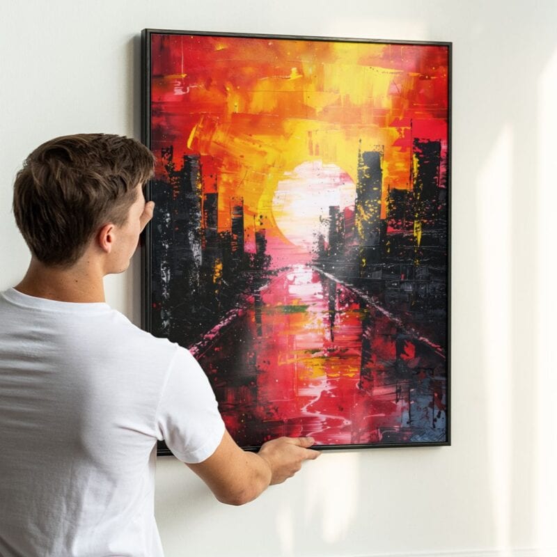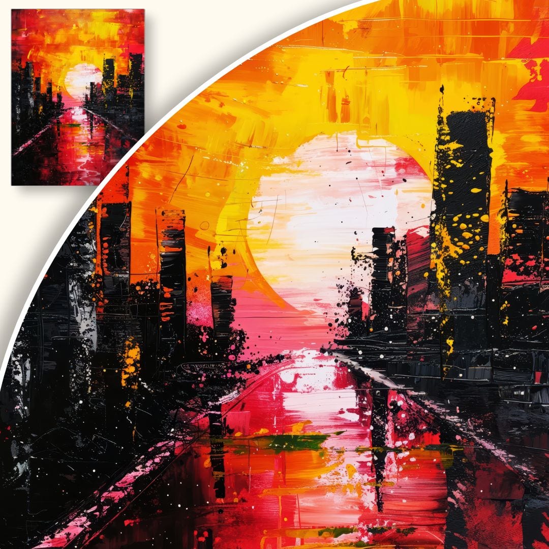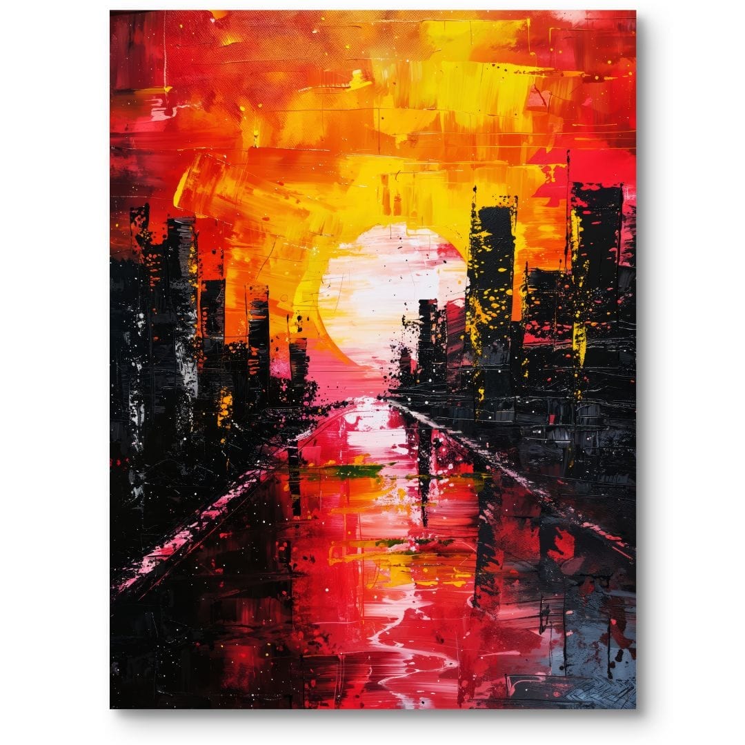 Ten obraz na płótnie przedstawia abstrakcyjny, dynamiczny krajobraz miasta o zachodzie słońca. Centralnym punktem kompozycji jest imponujące, rozświetlone słońce, których promienie rozlewają się po niebie w intensywnych odcieniach czerwieni, żółci i pomarańczu. Po bokach obrazu widać wyraziście zarysowane sylwetki wieżowców w ciemnych, kontrastowych barwach, które podkreślają nowoczesny charakter miejskiej scenerii. Migocząca rzeka odbija światło i kolory nieba, dodając głębi i dramatyzmu całej kompozycji.
