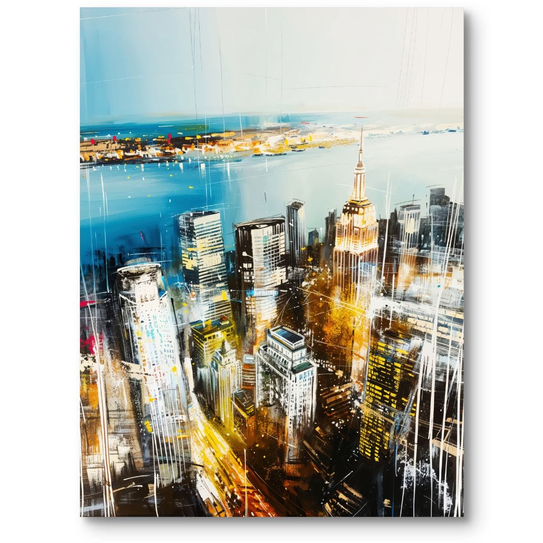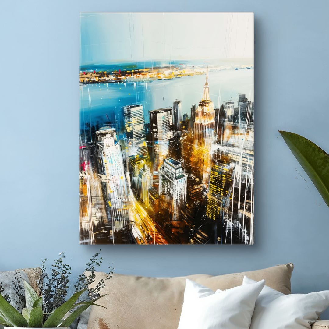Obraz na płótnie przedstawia tętniący życiem Nowy Jork nocą. Centralnym punktem kompozycji jest monumentalny, rozświetlony Empire State Building otoczony szklanymi ścianami innych drapaczy chmur. W tle rozpościera się pulsująca panorama miasta, z której błyszczące światła odbijają się malowniczo na wodzie, podkreślając wyjątkowy charakter metropolii.