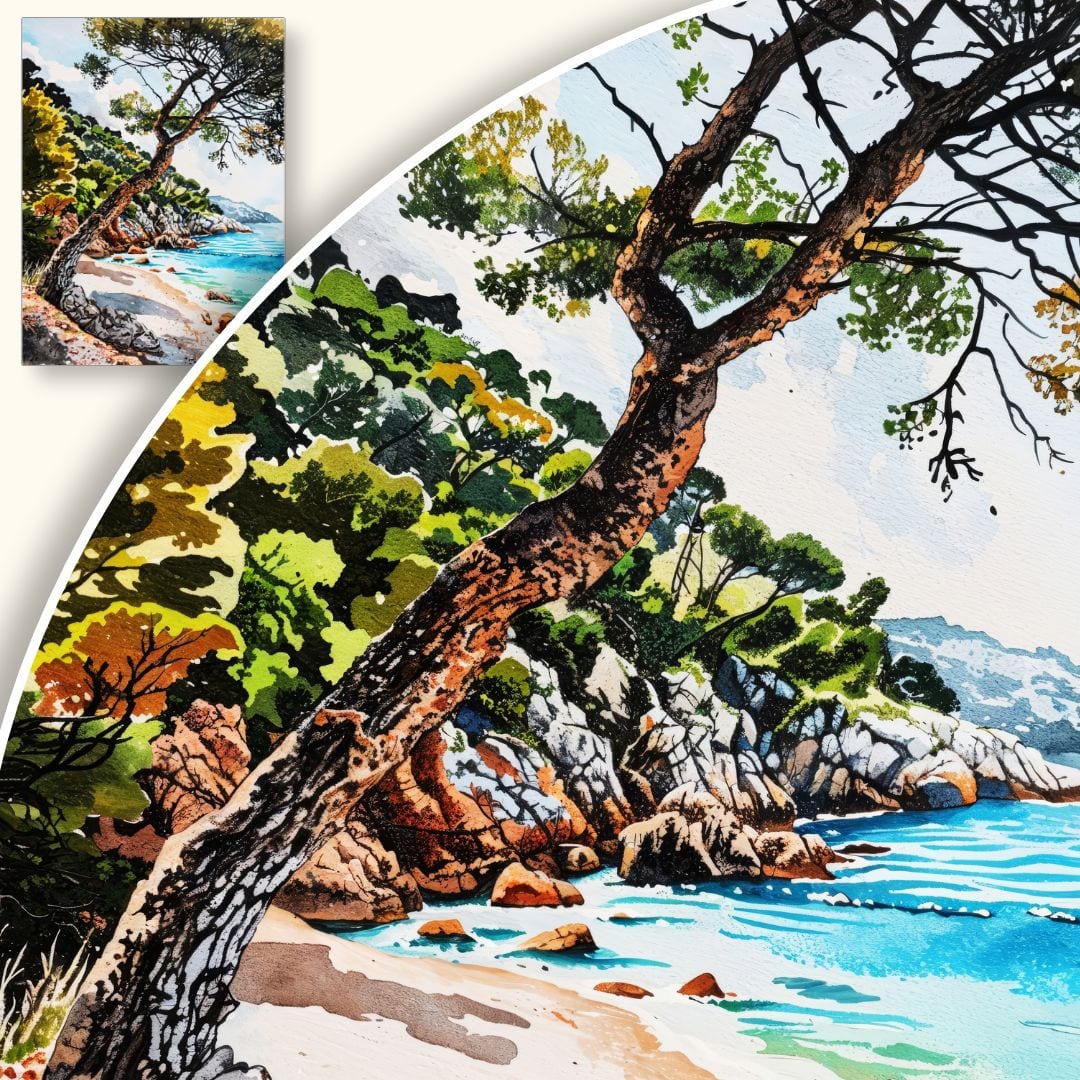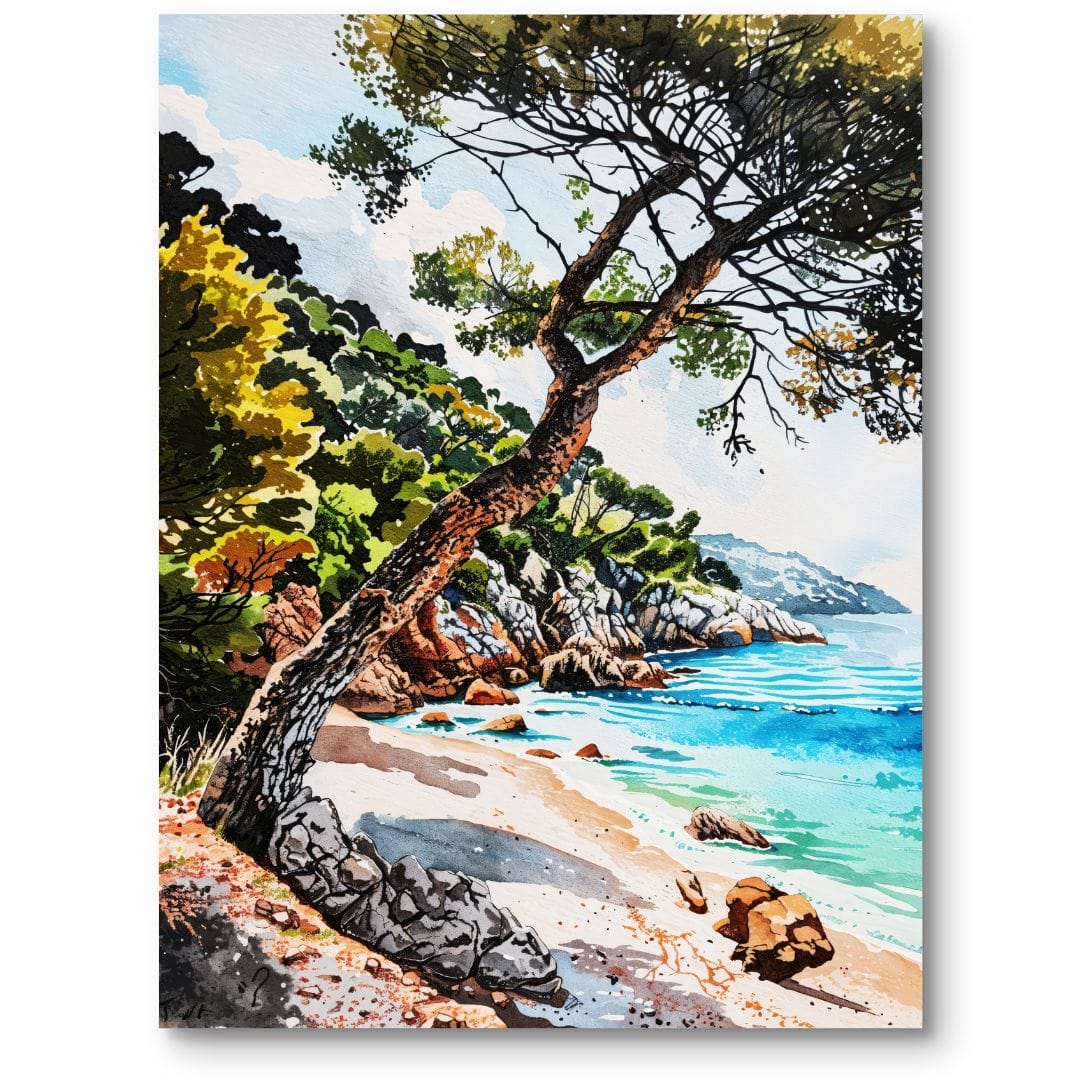 Obraz na płótnie ukazuje malowniczy krajobraz plaży, otulonej bujną zielenią oraz spokojnymi wodami morza. Na pierwszym planie wyróżnia się malowniczo wygięte drzewo, które pochyla się nad miękkim, jasnym piaskiem. W tle dostrzec można majestatyczne klify oraz zalesione wzgórza, dodające głębi i naturalnego uroku kompozycji. Łagodne fale delikatnie muskają brzeg, wprowadzając harmonię oraz atmosferę beztroskiego odpoczynku.
