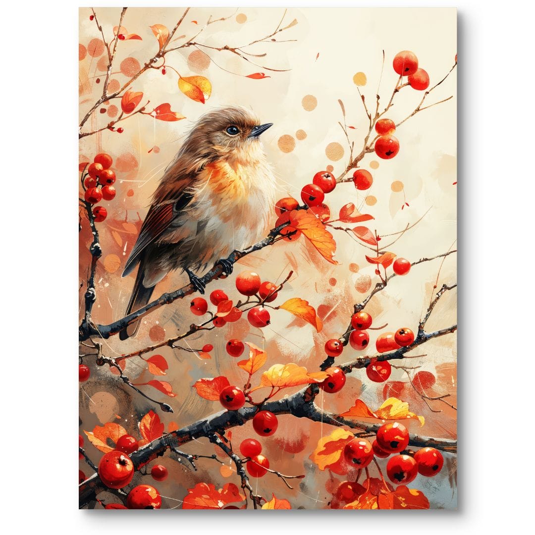 Na tym wyjątkowym obrazie podziwiać można ptaka spoczywającego na gałęzi obsypanej czerwonymi, jesiennymi liśćmi oraz dorodnymi jagodami. Artysta z niezwykłą dbałością oddał szczegóły ptasich piór, a realistyczna kompozycja sprawia, że malowidło wiernie oddaje piękno i harmonię natury. Precyzja w odwzorowaniu faktur i kolorów przenosi widza w spokojny świat przyrody.