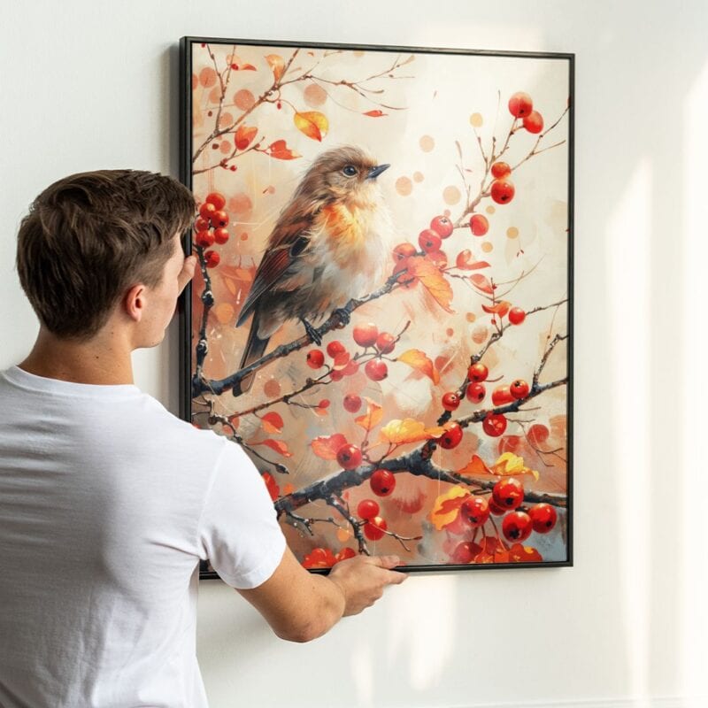 Centralnym punktem kompozycji jest delikatna sylwetka ptaka, otulona miękkim światłem i otoczona intensywnymi odcieniami pomarańczu, czerwieni oraz brązu. Subtelne światło, które rozświetla gałązki i liście, nadaje obrazowi głębi i wyjątkowej przestrzenności, a harmonijna kolorystyka wprowadza do wnętrza poczucie ciepła i równowagi.