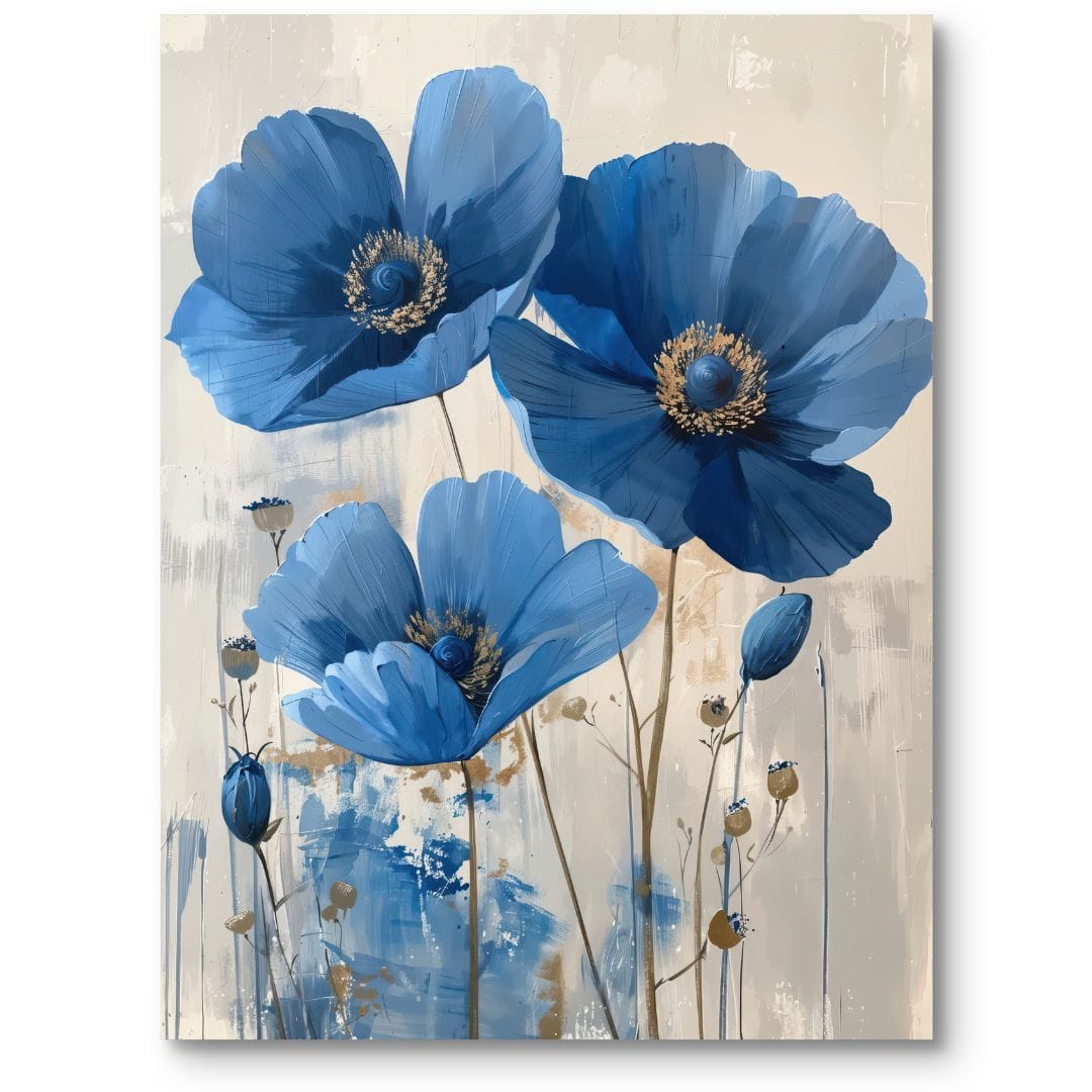 Obraz na płótnie ukazuje trzy niebieskie maki, delikatnie wyróżnione na tle subtelnych, rozmytych odcieni beżu i bieli. Artysta z niezwykłą precyzją oddał szczegółowość płatków oraz łodyg, dzięki czemu kwiaty sprawiają wrażenie niemal dotykalnych. Malarskie, impresjonistyczne tło podkreśla naturalność kompozycji, dodając obrazowi lekkości i głębi.