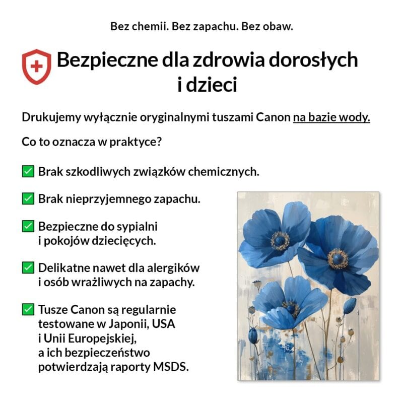 Tak, absolutnie! Drukujemy wyłącznie certyfikowanymi, bezwonnymi tuszami pigmentowymi Canon Lucia Pro na bazie wody. Są one w pełni bezpieczne dla zdrowia, nie zawierają rozpuszczalników i mogą być bez obaw stosowane w sypialniach i pokojach dziecięcych.
