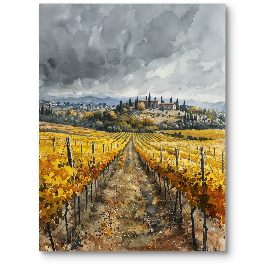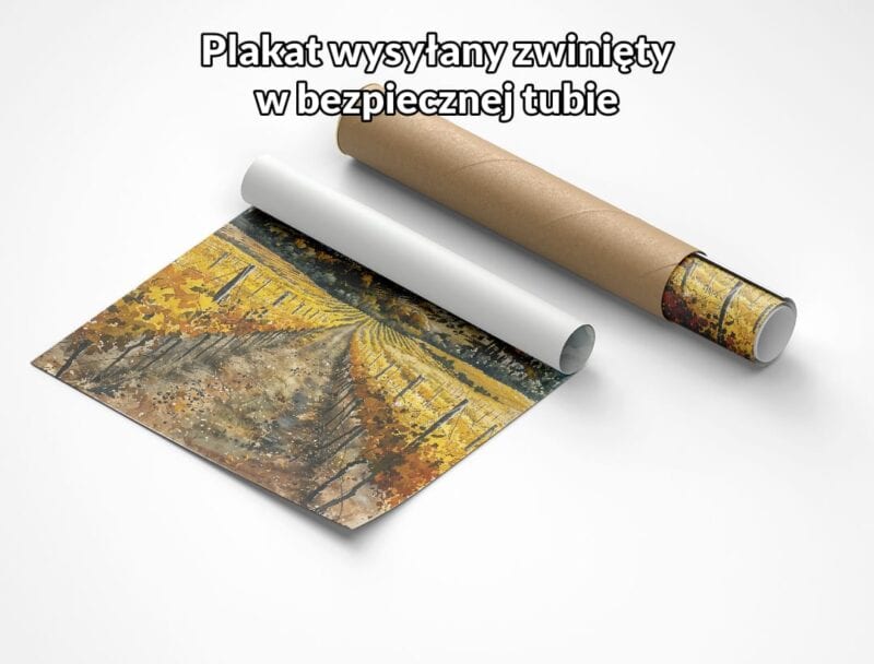 Obraz na płótnie ukazuje rozległy, jesienny krajobraz winnicy, w którym złociste i brązowe liście winorośli tworzą malowniczą mozaikę barw. Na pierwszym planie prowadzi nas wąska ścieżka pośród szeregów winnych krzewów, zapraszając do spaceru wśród natury. Na horyzoncie majaczą przytulne, wiejskie zabudowania otoczone drzewami, a całość tonie pod miękkim, pochmurnym jesiennym niebem.