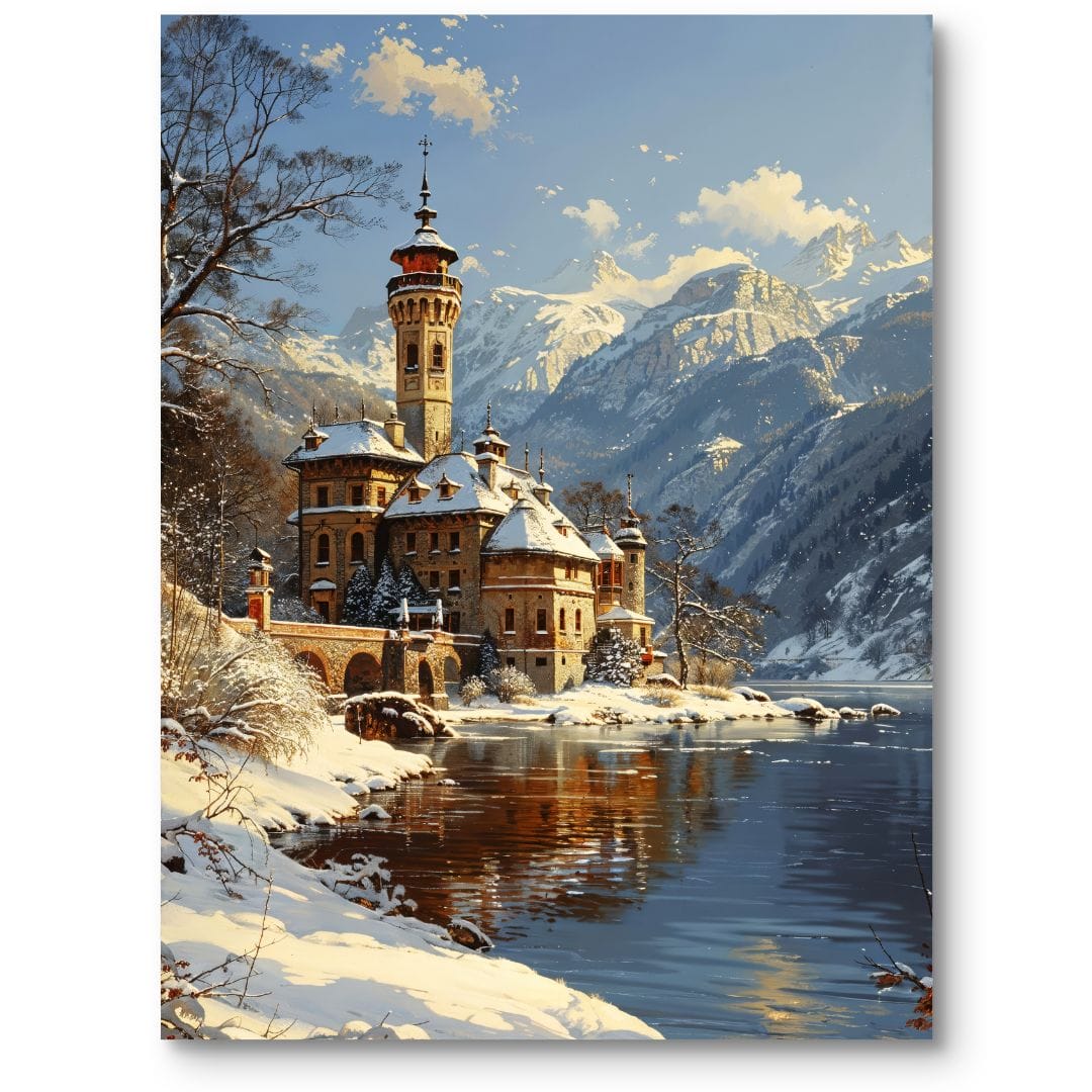 Ten obraz na płótnie ukazuje malowniczy, zimowy krajobraz, którego centralnym punktem jest majestatyczny zamek położony wśród ośnieżonych gór. Warownia wznosi się nad zamarzniętym jeziorem i otoczona jest malowniczymi, zaśnieżonymi drzewami. W głębi tła rozpościerają się białe, monumentalne szczyty górskie, nadając kompozycji aurę spokoju, tajemniczości i odrobiny baśniowości. Ta idylliczna scena przywołuje na myśl klasyczne legendy i opowieści z dawnych czasów.