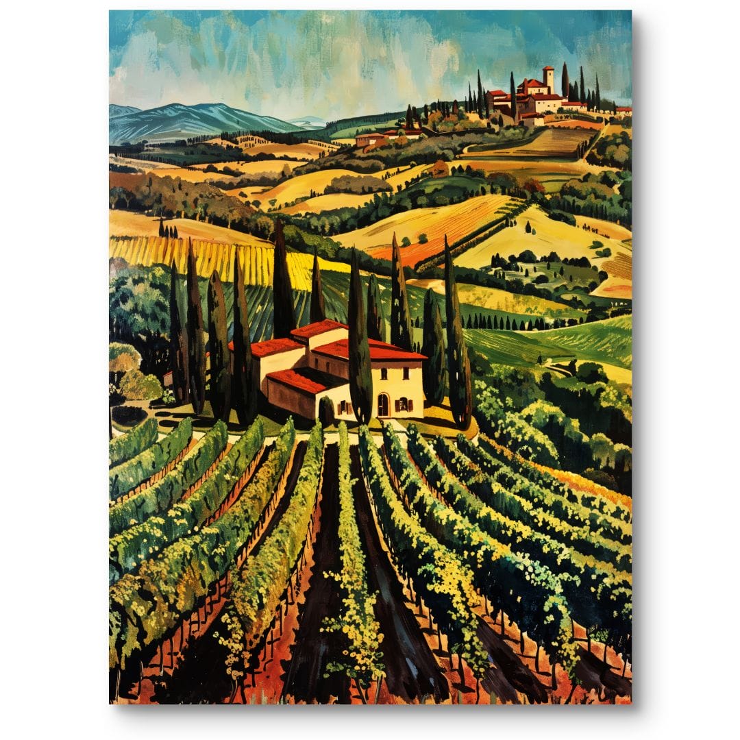 Ten zachwycający obraz na płótnie przenosi nas do słonecznej Toskanii, prezentując malowniczy pejzaż winnicy skąpanej w letnim świetle. W pierwszym planie rozpościerają się regularne rzędy bujnych winorośli, prowadzące wzrok aż po horyzont. Pośród pagórków tonących w zieleni pojawiają się charakterystyczne włoskie budynki i wieże, które dodają kompozycji niepowtarzalnego uroku. Całość emanuje spokojem i pięknem krajobrazu znanego ze swojej włoskiej magii.