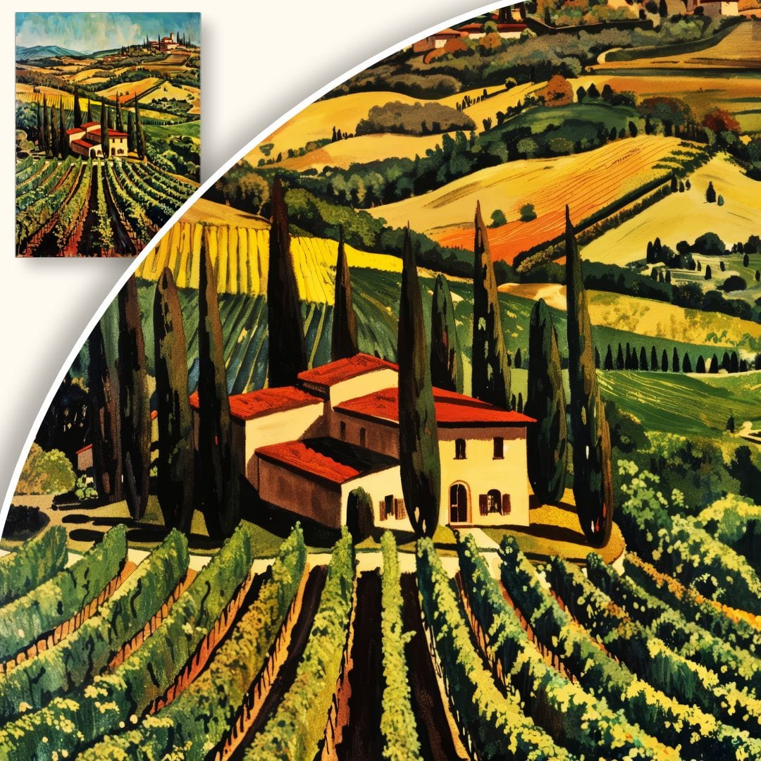 - Tematyka: Toskański krajobraz, natura, winnica, wzgórza