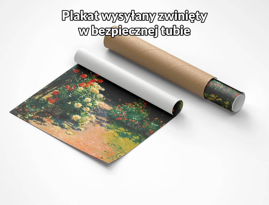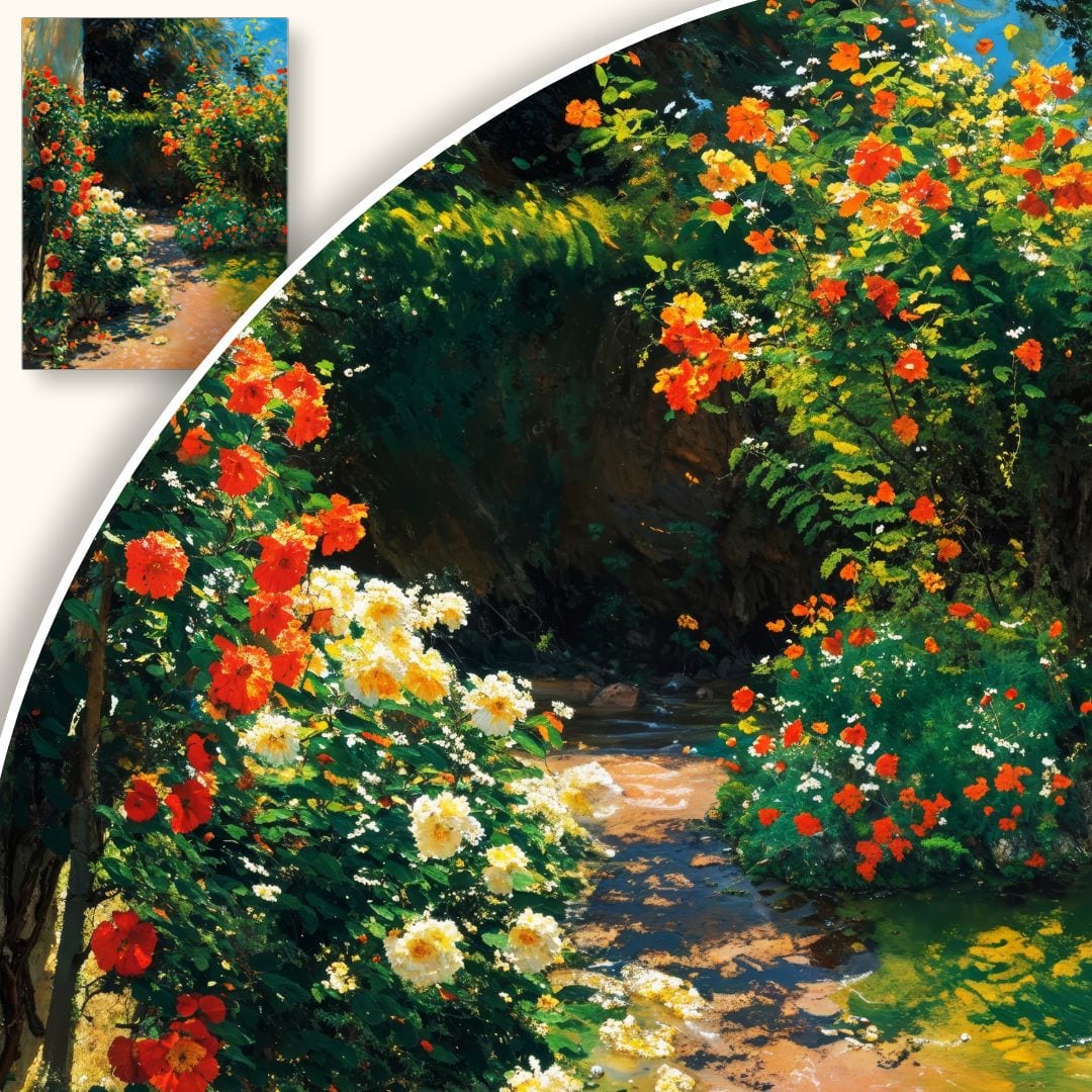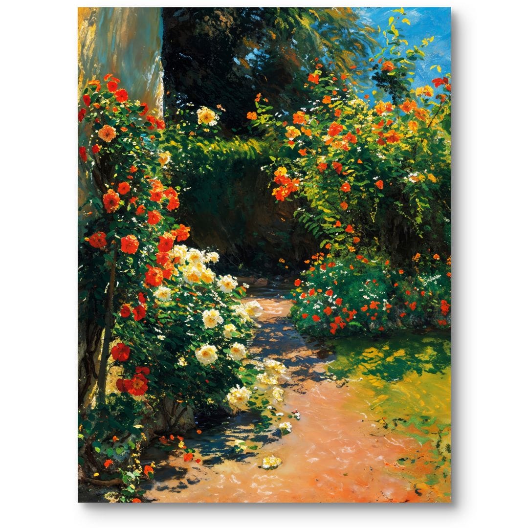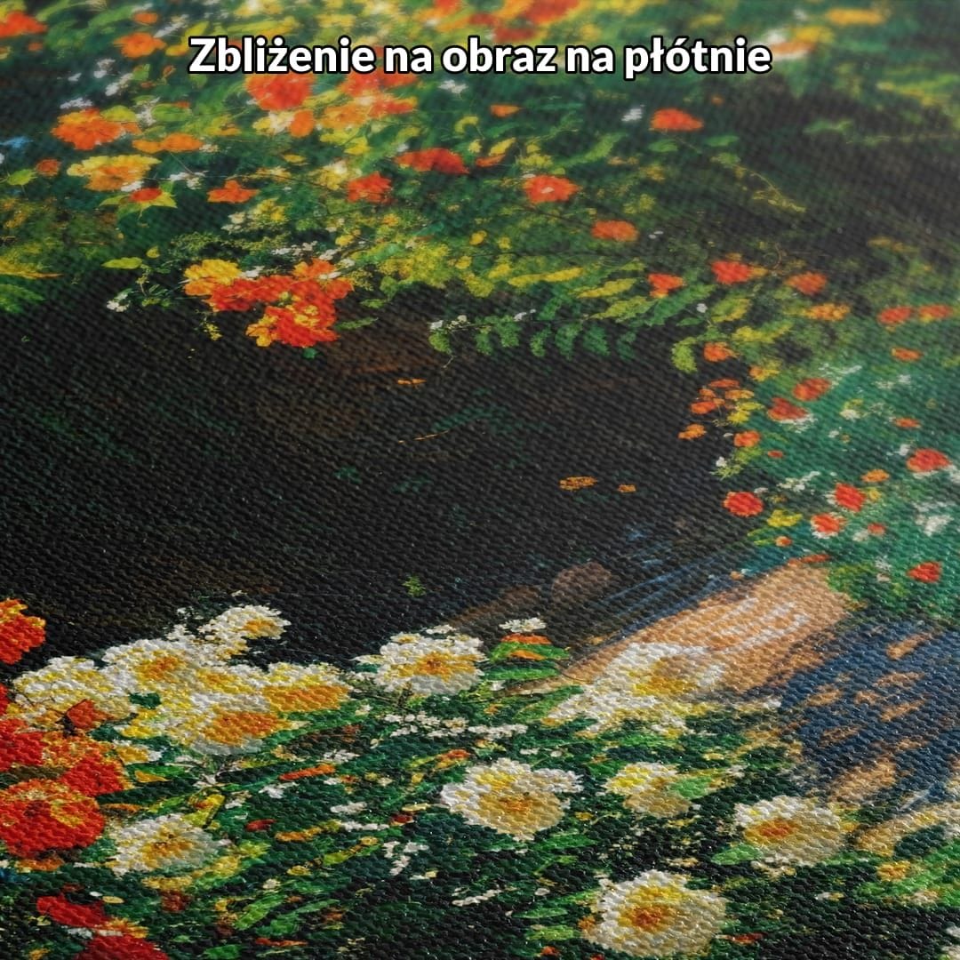Obraz na płótnie ukazuje malowniczy ogród pełen rozkwitających kwiatów, z przewagą subtelnych i radosnych róż. Urokliwa ścieżka prowadzi przez soczystą roślinność, oplatając przestrzeń ferią barw, które przenoszą widza do świata pełnego naturalnej harmonii. Artystyczna wizja oddaje piękno przyrody i zachwyca klimatem spokojnego, romantycznego zakątka.