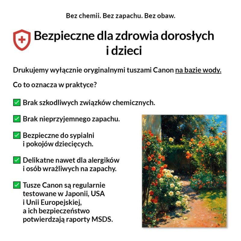 My drukujemy wyłącznie na pigmentowych tuszach Canon LUCIA PRO, bezpiecznych, bezzapachowych i certyfikowanych.