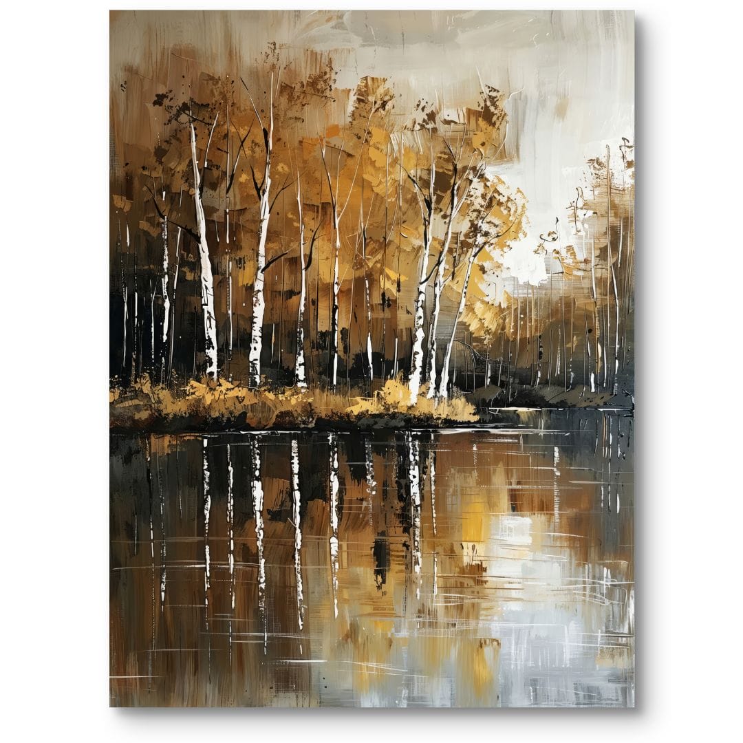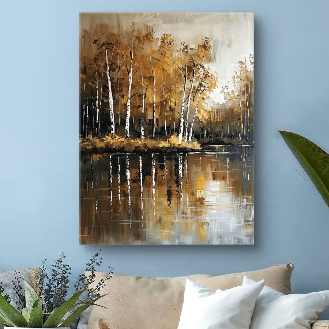 Ten niezwykły obraz na płótnie ukazuje urokliwy jesienny pejzaż – malowniczy las otulający brzegi spokojnego jeziora. Dominują bogate odcienie brązu i złota, które nadają całości aurę ciepła oraz przytulności. Na pierwszym planie dostrzec można białe, smukłe pnie brzóz, subtelnie kontrastujące z głębią lasu i efektownie odbijające się w lustrzanym odbiciu wody.