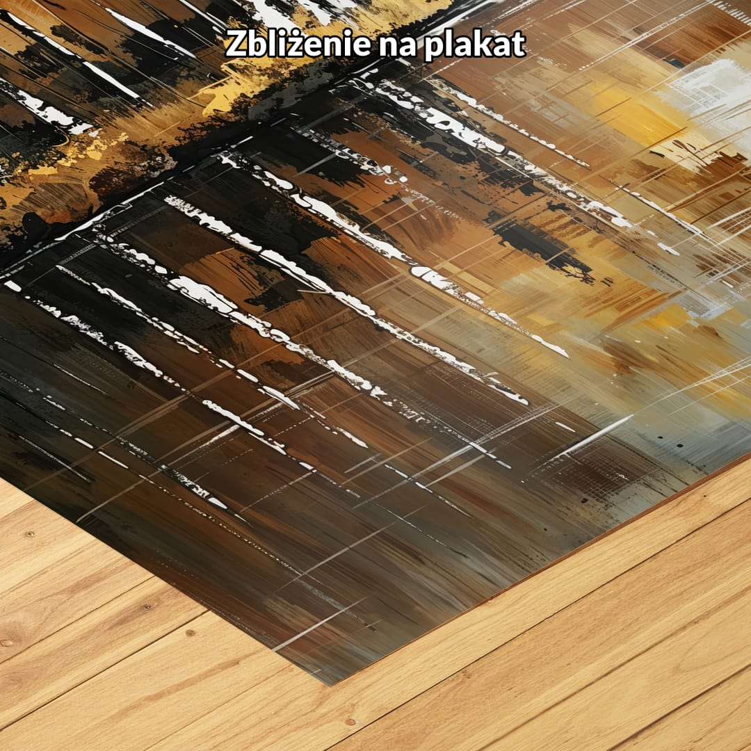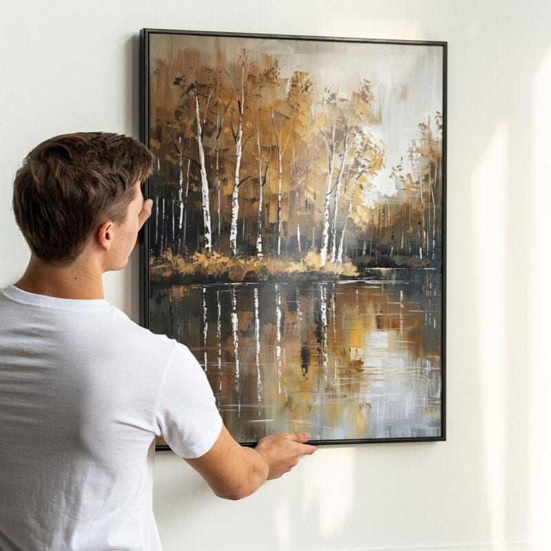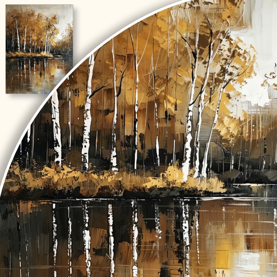 Centralnym elementem kompozycji jest las odbijający się w tafli jeziora. Harmonię całości dopełniają ciepłe barwy – brązy i złota – efektownie skontrastowane z chłodniejszym, ciemnym tłem. Światło opadające z góry subtelnie podkreśla smukłość brzóz i potęguje wrażenie obecności w samym sercu natury.