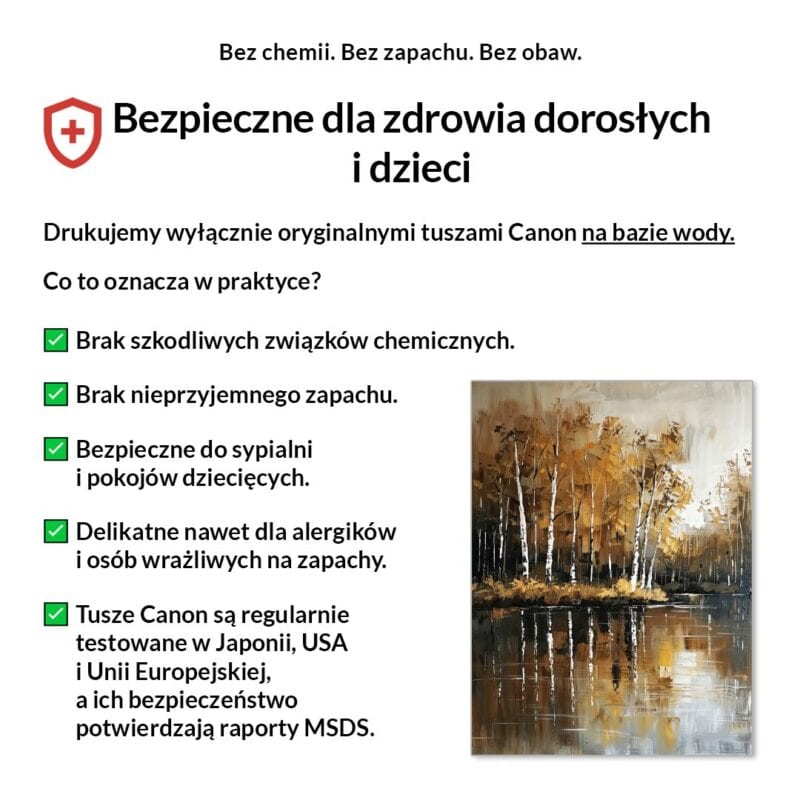 Tak, absolutnie! Drukujemy wyłącznie certyfikowanymi, bezwonnymi tuszami pigmentowymi Canon Lucia Pro na bazie wody. Są one w pełni bezpieczne dla zdrowia, nie zawierają rozpuszczalników i mogą być bez obaw stosowane w sypialniach i pokojach dziecięcych.