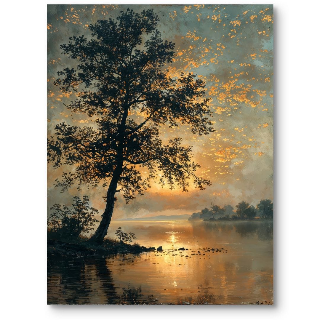 Obraz na płótnie ukazuje malowniczy krajobraz nad jeziorem o zachodzie słońca. W centrum kompozycji dominuje potężne drzewo, rzucające długie, romantyczne cienie na spokojną taflę wody. W oddali złote promienie słońca odbijają się w jeziorze, tworząc hipnotyzującą aurę tajemniczości i wyjątkowego uroku. To pejzaż, który oczarowuje prostotą, a zarazem siłą naturalnego piękna, wnosząc do wnętrza atmosferę spokoju i zachwytu nad przyrodą.