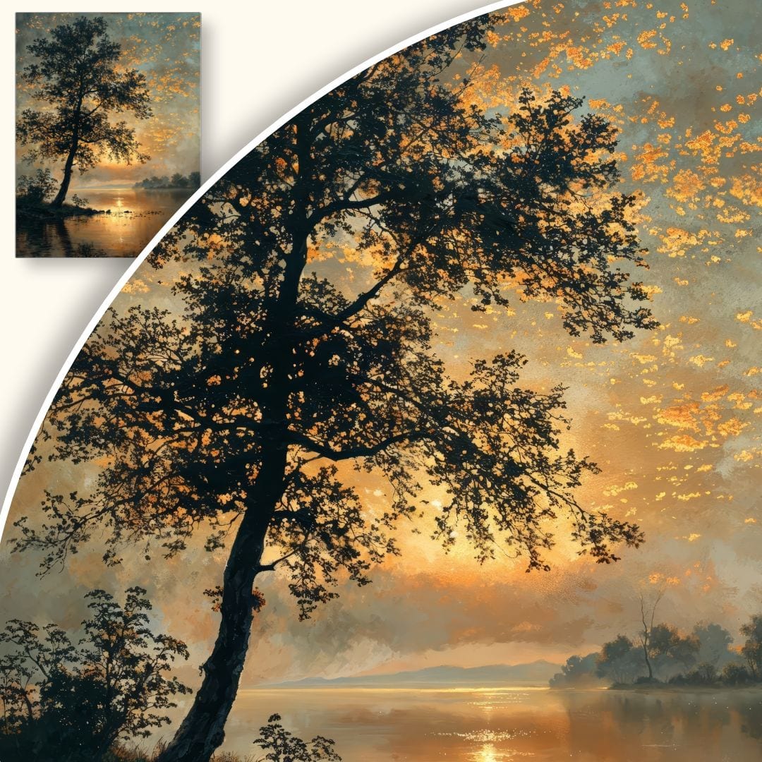 Malowanie krajobrazów w realistycznym stylu to tradycja sięgająca czasów mistrzów takich jak Ivan Szyszkin czy Caspar David Friedrich, którzy potrafili uchwycić złożoność natury oraz jej wpływ na ludzkie emocje. Motyw drzewa na tle jeziora i zachodu słońca był dla wielu artystów twórczą próbą zatrzymania ulotnych chwil refleksji nad pięknem świata.