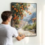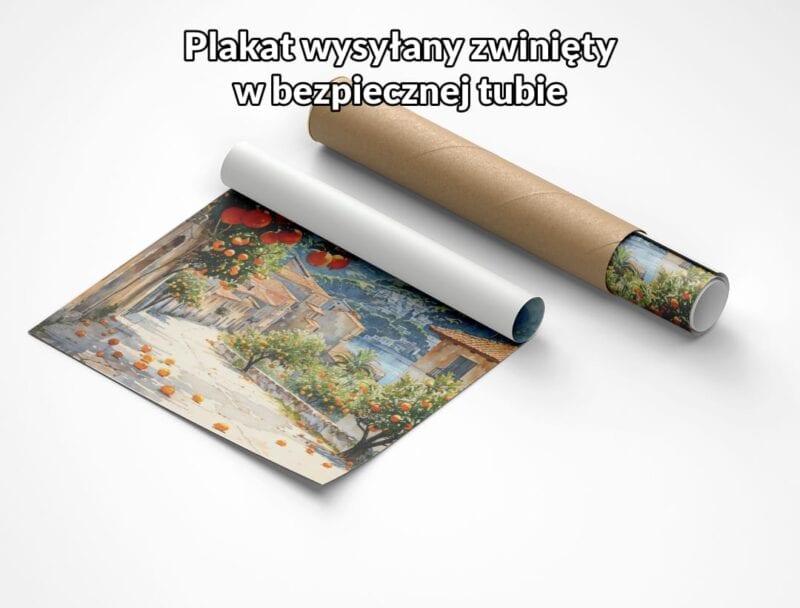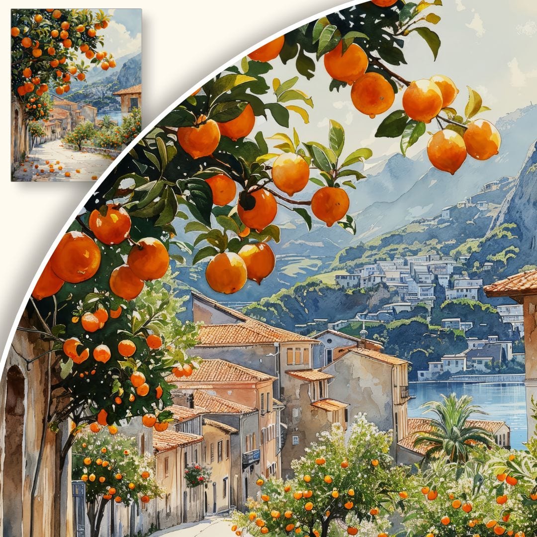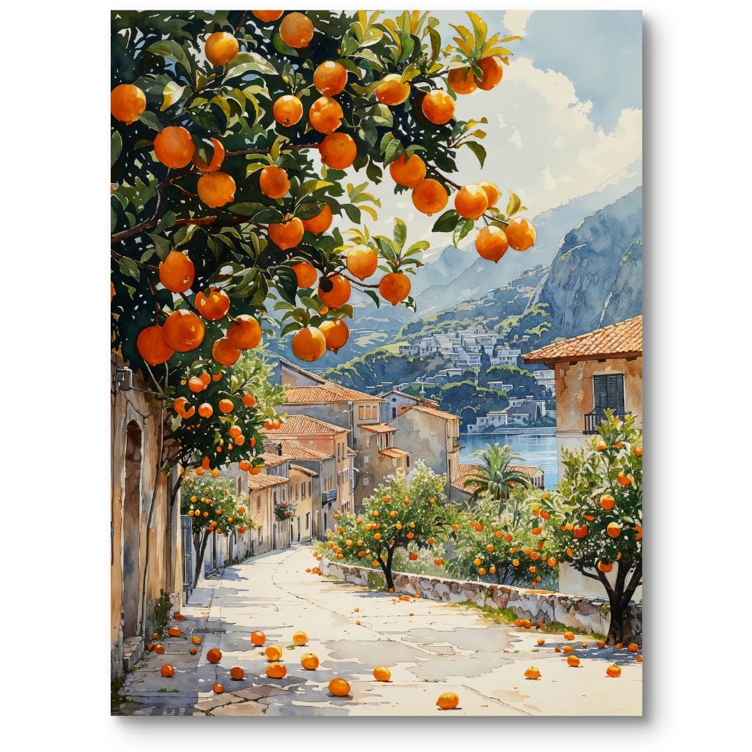 Obraz na płótnie zachwyca malowniczym przedstawieniem wioski, gdzie pomarańczowe drzewa obficie kwitną, rozświetlając pejzaż naturalną paletą ciepłych barw. Soczyste pomarańcze, opadające na brukowaną uliczkę, wprowadzają autentyczny klimat śródziemnomorskiej sielanki. W tle, wtopione w krajobraz rustykalne domy i wzgórza łagodnie opadają ku odległemu morzu, tworząc widok przepełniony spokojem i urokiem wiejskiego życia.